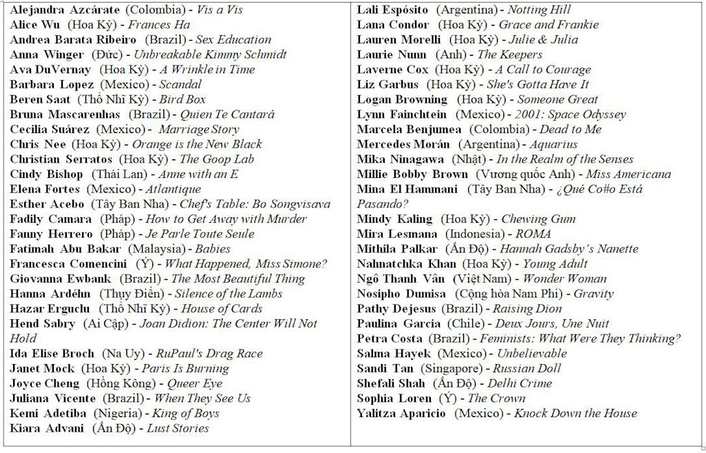 Danh sách 55 phụ nữ tài năng tham gia chương trình và các bộ phim được họ đề cử trong danh sách “Vì cô ấy đã xem”. |