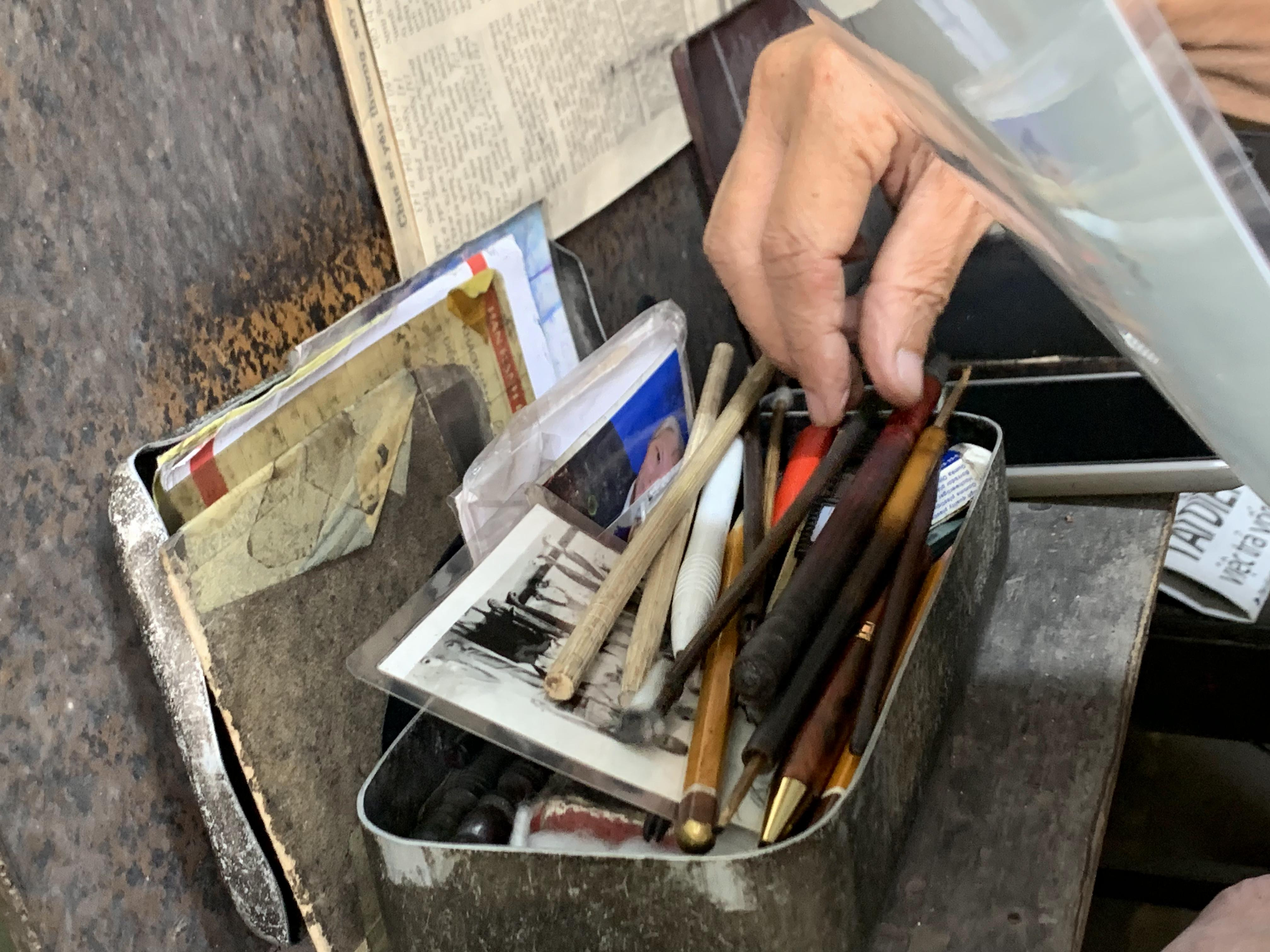Hộp dụng cụ của ông đầy chặt các loại bút vẽ, có loại do nhà máy sản xuất, có loại tự chế từ đũa tre, dây thép. Ông lấy bút nhẹ nhàng chấm màu vẽ mua ở cửa hàng họa cụ, phẩy tay qua lại trên bức chân dung một người đàn ông mới mất mà người nhà đặt vẽ làm tranh thờ.