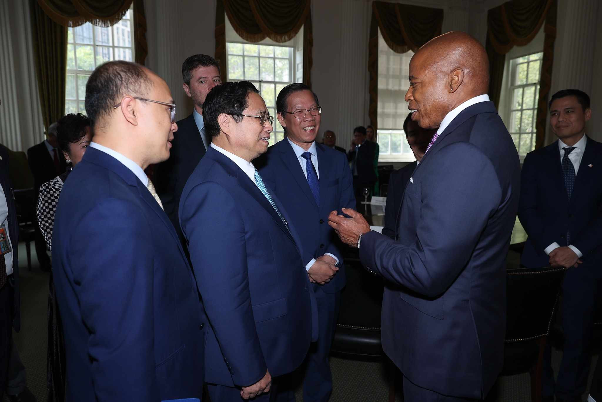 Thị trưởng thành phố New York Eric Adams nhiệt liệt chào mừng và bày tỏ vinh dự được đón Thủ tướng Phạm Minh Chính cùng đoàn đại biểu cấp cao Việt Nam tới thăm thành phố New York trong bối cảnh hai nước vừa nâng cấp quan hệ lên Đối tác Chiến lược toàn diện vì hòa bình, hợp tác và phát triển bền vững nhân chuyến thăm Việt Nam lịch sử của Tổng thống Mỹ Joe Biden vừa qua.