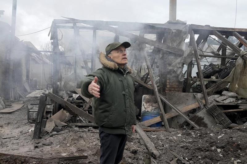 | Người đàn ông Ukraine đứng trước căn nhà của mình đã bị phá hủy hoàn toàn ở làng Horenka, lân cận thủ đô Kiev. Ảnh: AP |