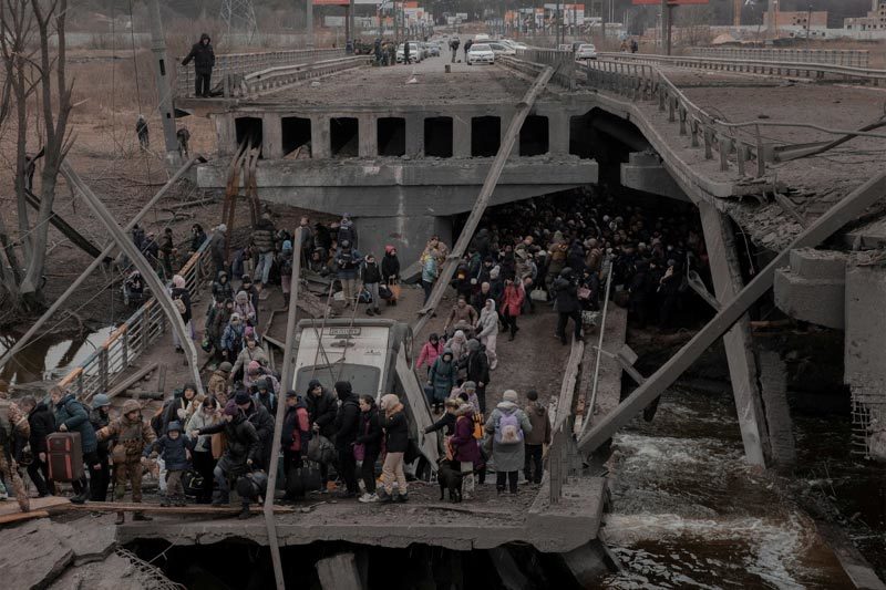 | Đám đông người dân vượt qua một cây cầu bắc ngang sông bị phá hủy để rời khỏi Irpin. Ảnh: AP |