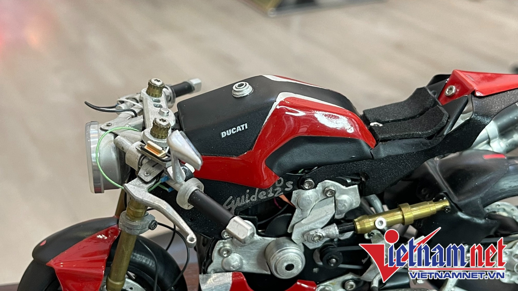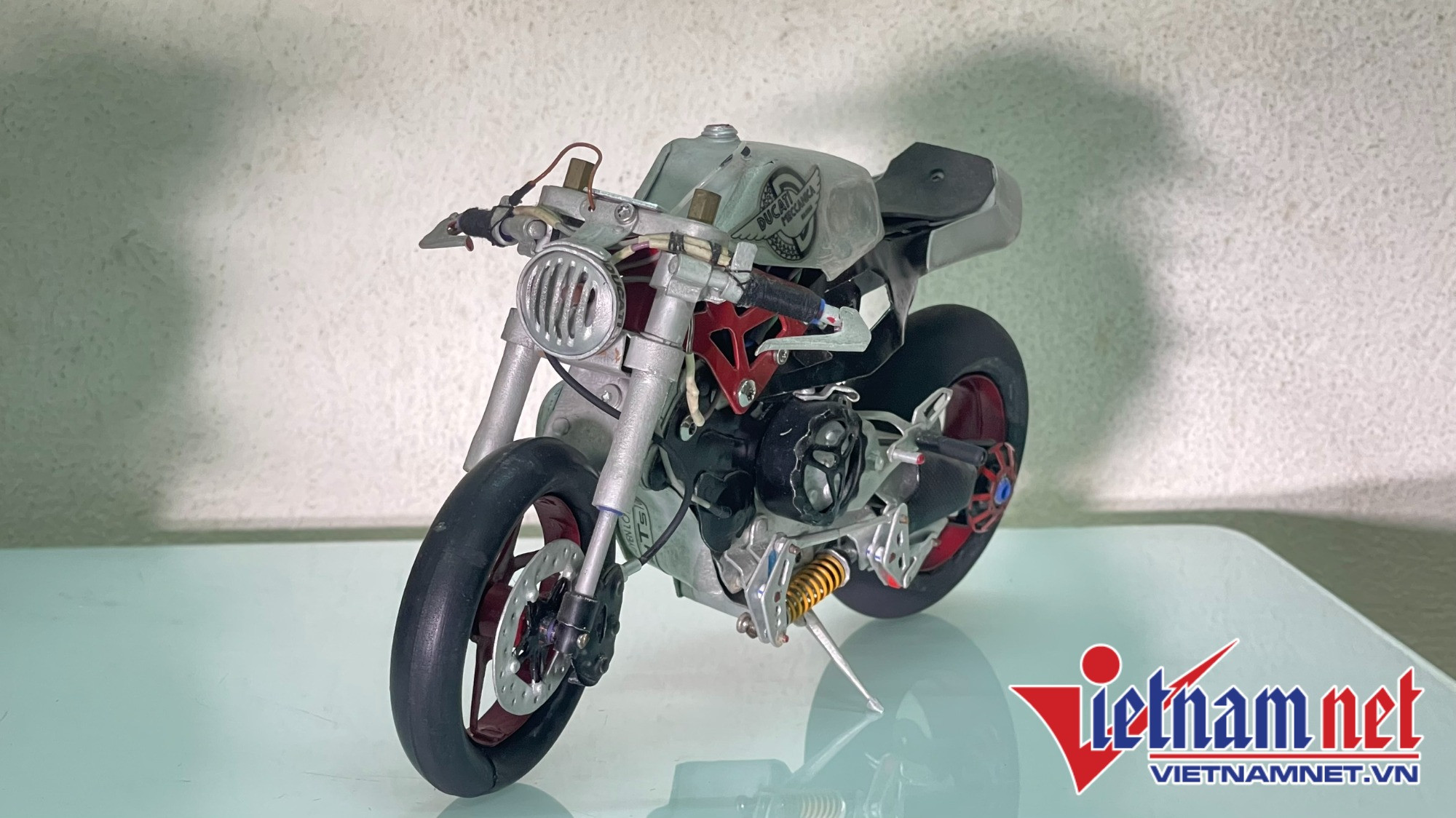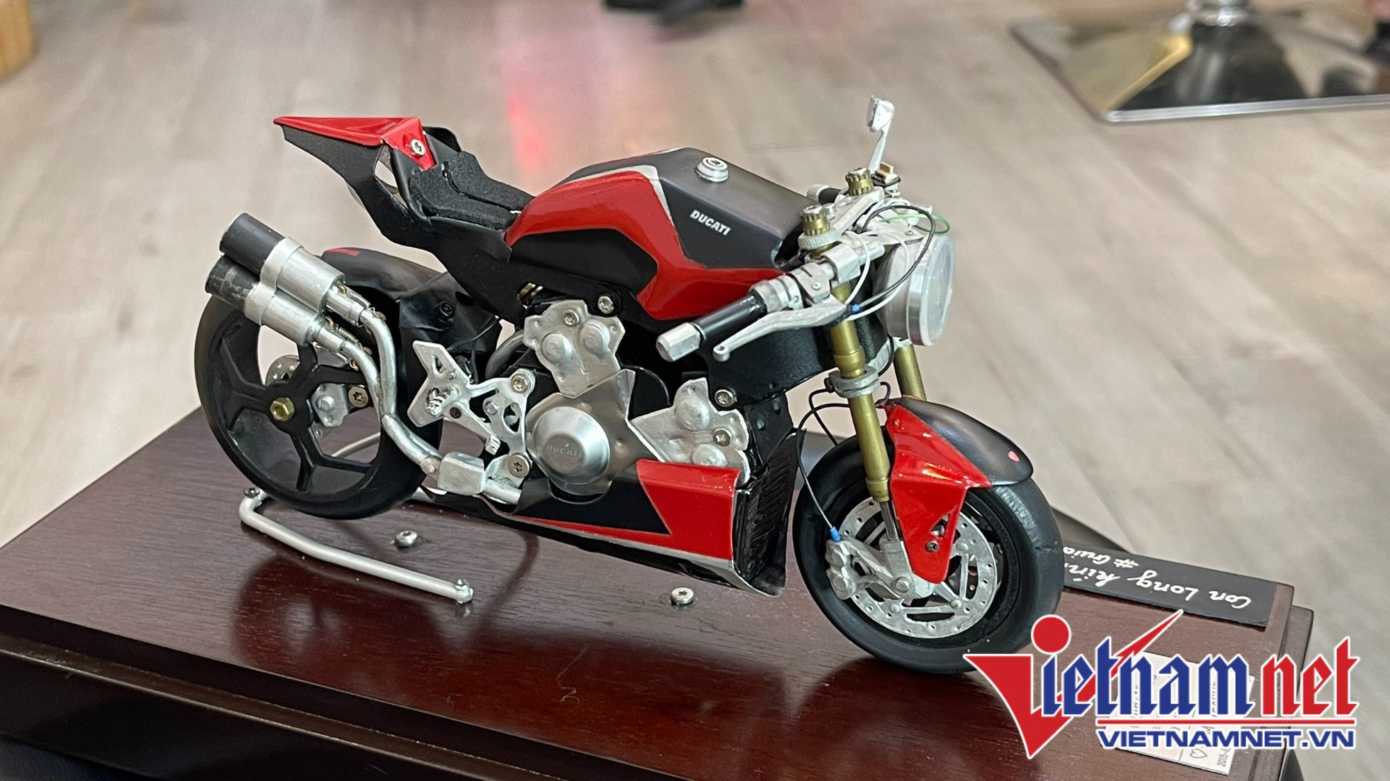 Đây là chiếc Ducati 1199 Panigale, một trong những siêu phẩm nổi tiếng được làm ra dưới bàn tay tài năng của anh Long. Mẫu xe thoạt nhìn không khác gì so với xe thật.