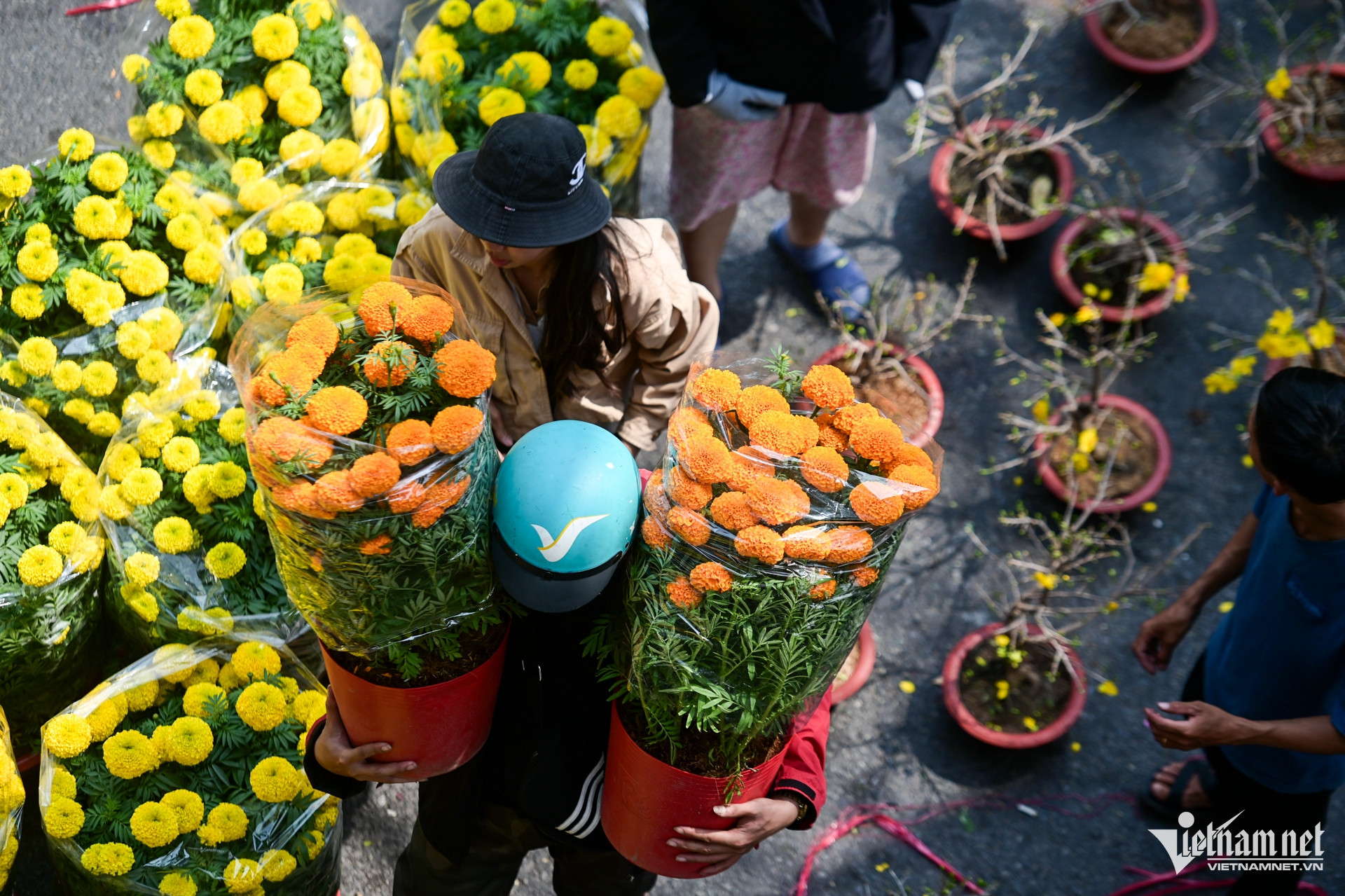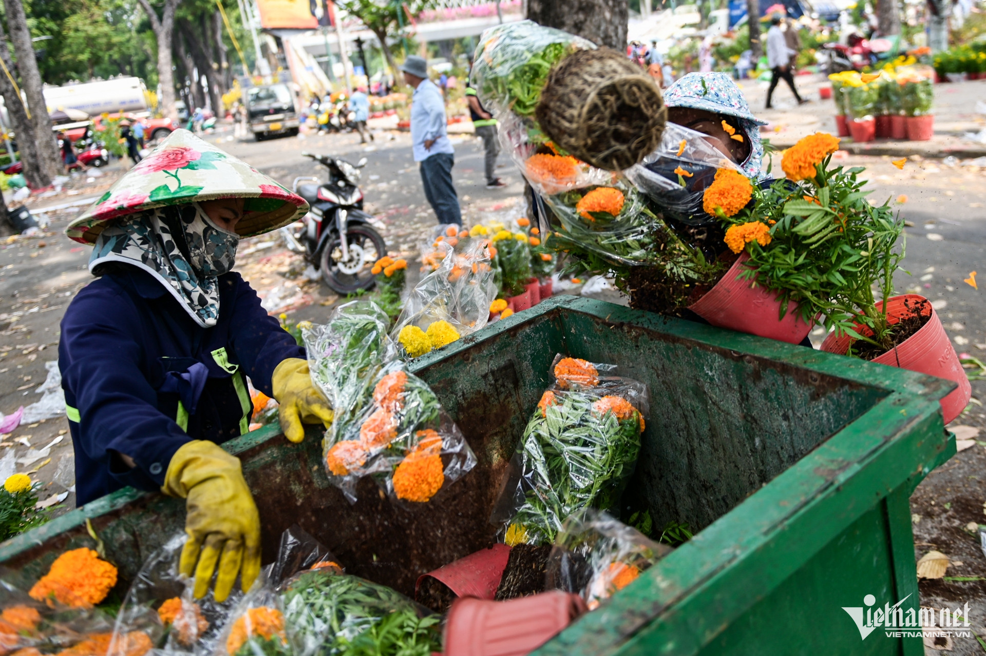 Hơn 200 chậu hoa cúc vạn thọ bán ế bị vứt đi được các công nhân vệ sinh thu gom vào xe rác. Theo chủ số hoa này, giá bán là 150.000 đồng/cặp, nhưng đến giờ trả mặt bằng người mua trả giá 50.000 đồng/cặp nên thà bỏ chứ không bán.