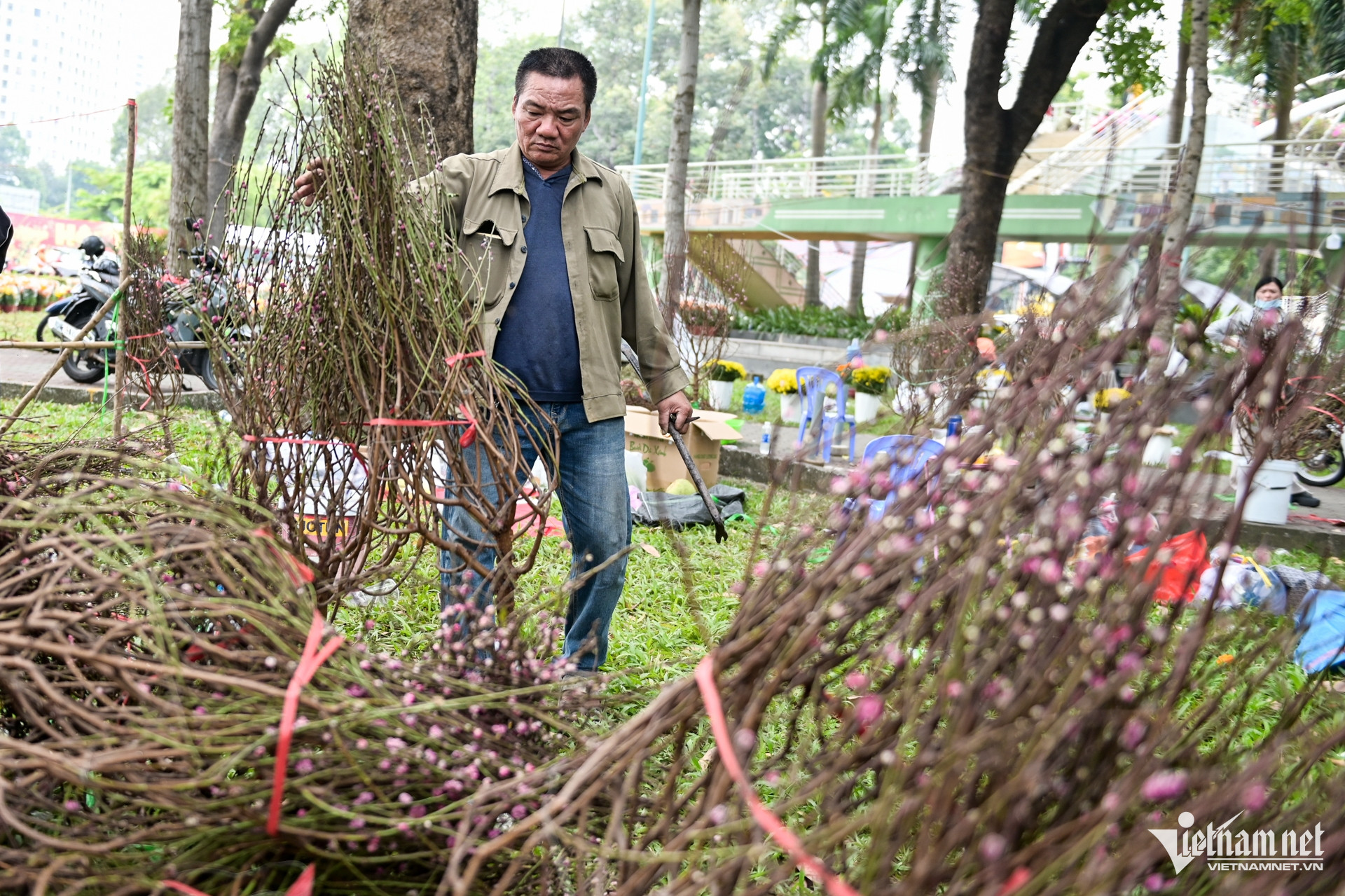 Anh Long cố nán lại bán nốt gần 20 cây đào. "Số đào này nếu không bán thì cũng bỏ rất uống nên tôi sẽ bán nốt tới chiều. Nhiều người trả giá rất thấp tôi đành đồng ý", anh Long nói.
