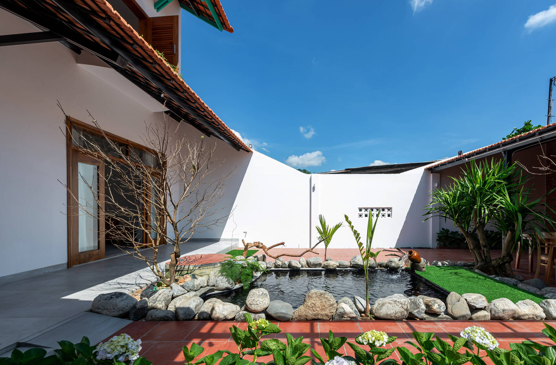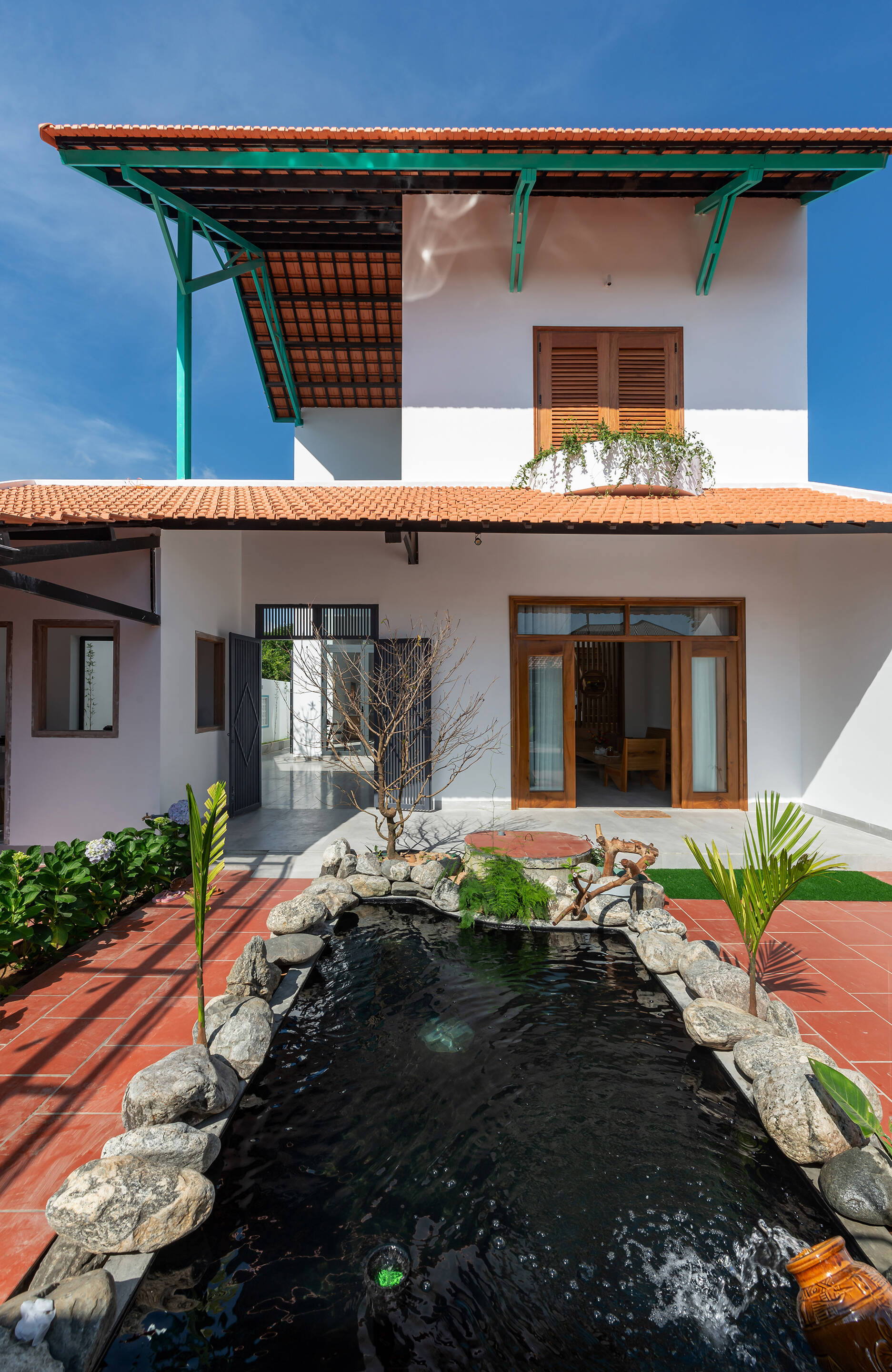 Mảnh đất nằm ở mặt đường quốc lộ nên nhóm đã tạo ra không gian sống với trước mặt là sân vườn, bể cá koi. Khu nhà ở đẩy lùi vào trong nhằm tạo sự yên tĩnh, thanh bình.