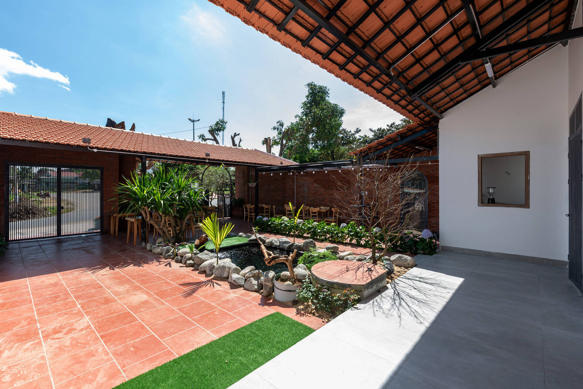 Phần sân vườn tận dụng để kinh doanh quán cà phê. Khu vực này sử dụng mái ngói truyền thống, xây gạch thẻ để mộc, sàn lát gạch bát tràng để hạn chế chi phí đầu tư nhưng vẫn mang đến nét mộc mạc, yên bình.