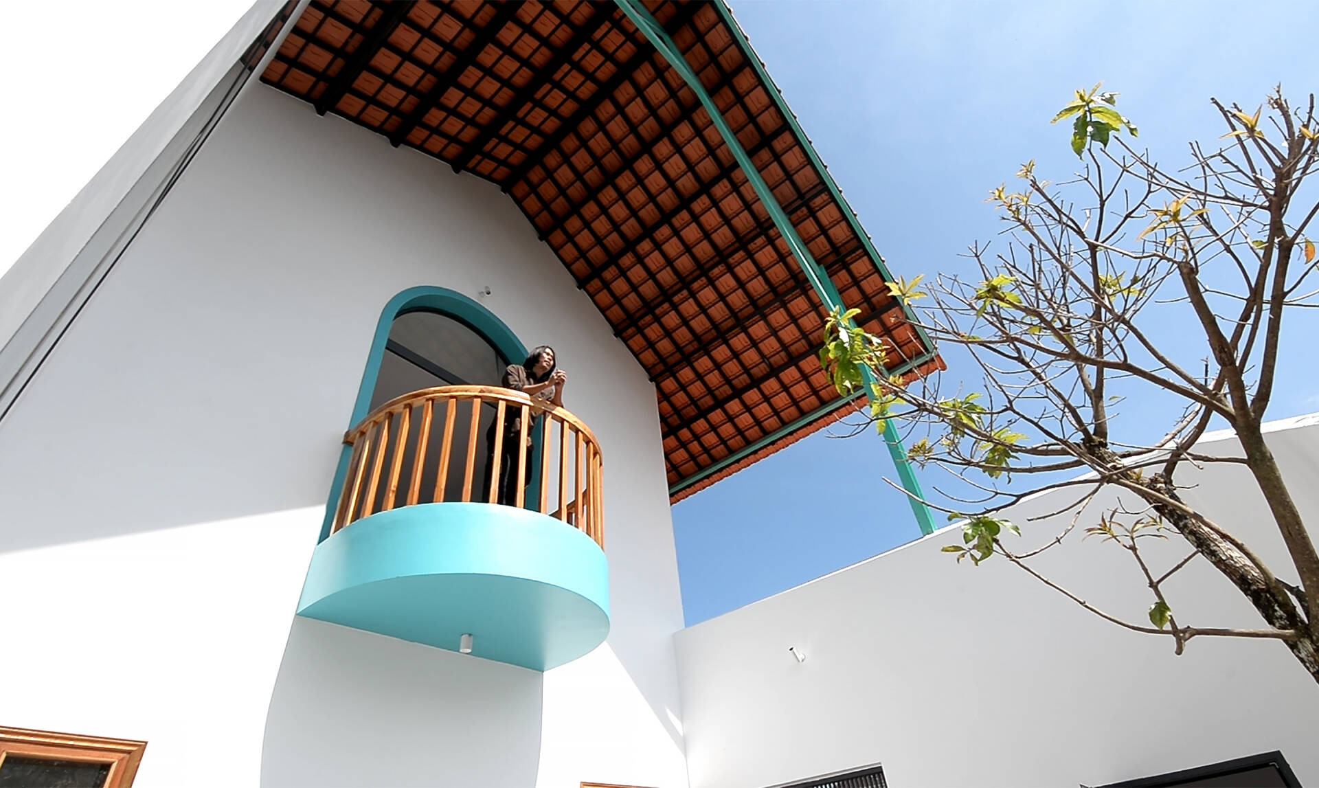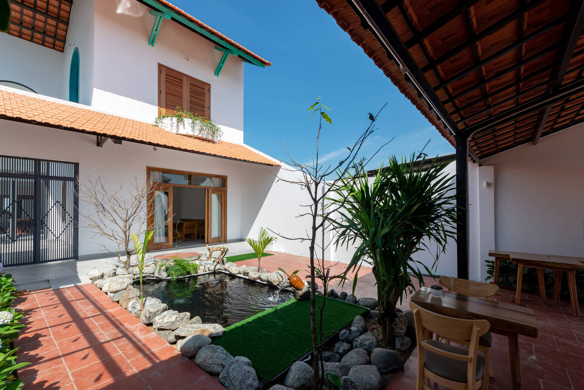Thiết kế mái hiên lớn giúp che chắn nắng cho khối nhà chính.Ngôi nhà được chia ra 2 cổng riêng biệt, 1 cổng vào sân nhà và dẫn tới phòng khách riêng của gia đình, 1 cổng dành cho quán cà phê, giúp giao thông tách biệt và tối ưu sự riêng tư cho chủ nhà. Hồ nước và cây xanh để ngăn cách không gian quán cà phê và khối nhà ở, nhằm giúp gia chủ có sự riêng tư mà vẫn kết nối, không gây bí bách.Thiết kế quầy pha chế nằm gần vị trí khu bếp ăn để thuận tiện cho việc quản lý quầy và giúp gia chủ dễ dàng thao tác khi cần.Bố trí các không gian mở trong nhà ở tầng trệt và tầng lầu, sao cho các ô cửa kính và các khoảng trống xuất hiện nhiều để gia chủ có thể trông coi quán một cách dễ dàng, nhanh chóng nhận biết khi có khách đến.