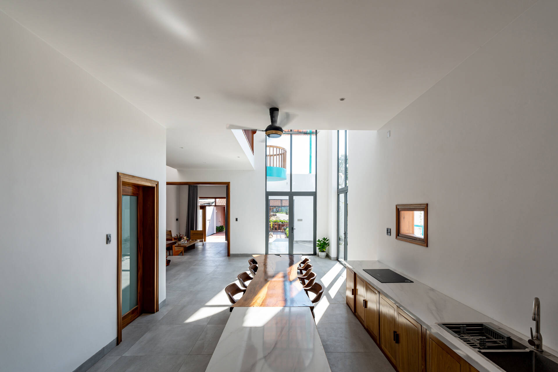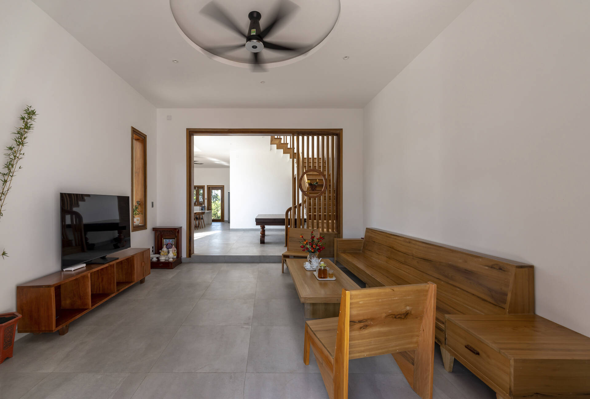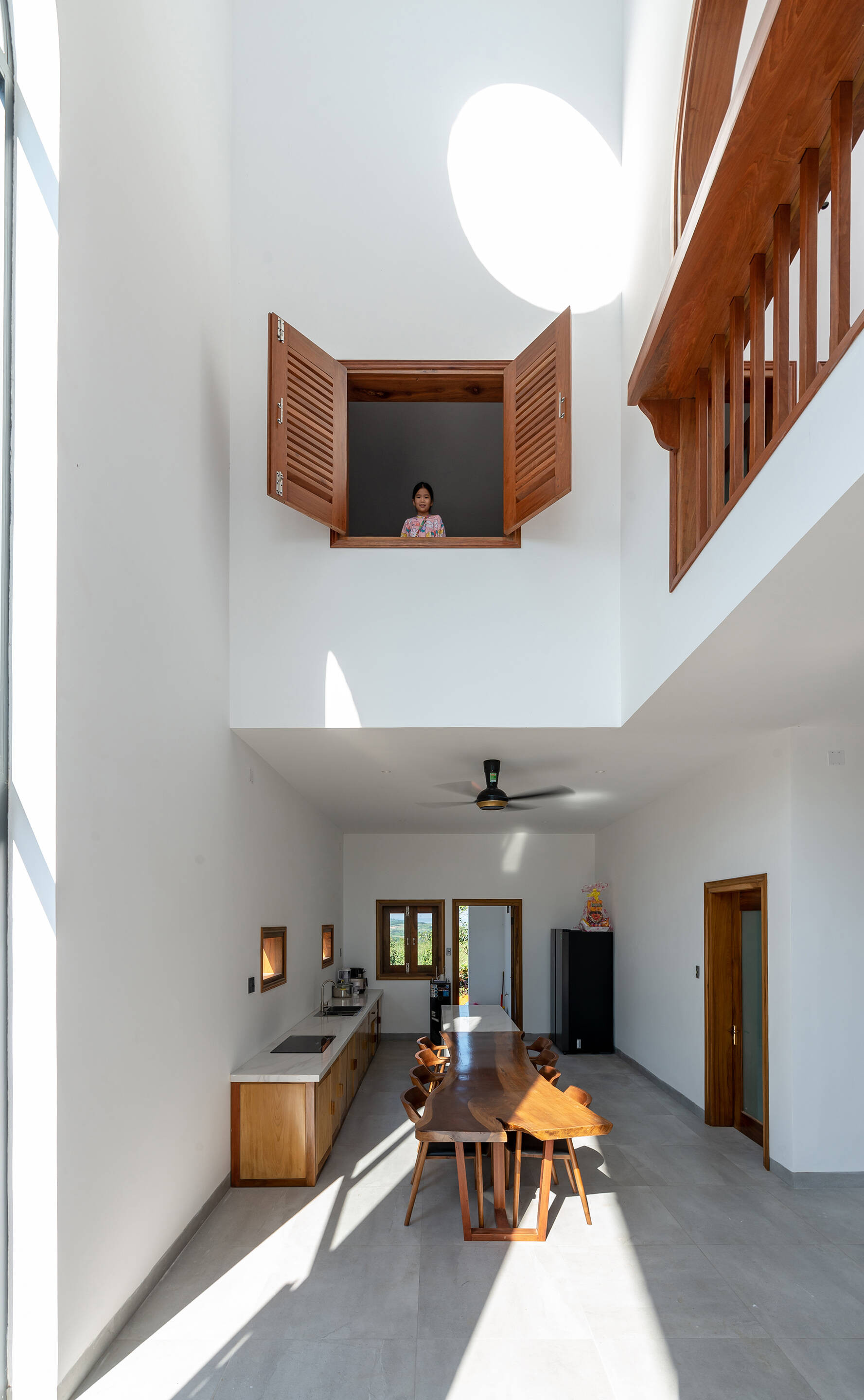Nội thất của khối nhà chính chủ yếu dùng vật liệu gỗ tự nhiên truyền thống của khu vực địa phương, nhưng được thiết kế đơn giản, hiện đại để không gian nhẹ nhàng và thông thoáng.