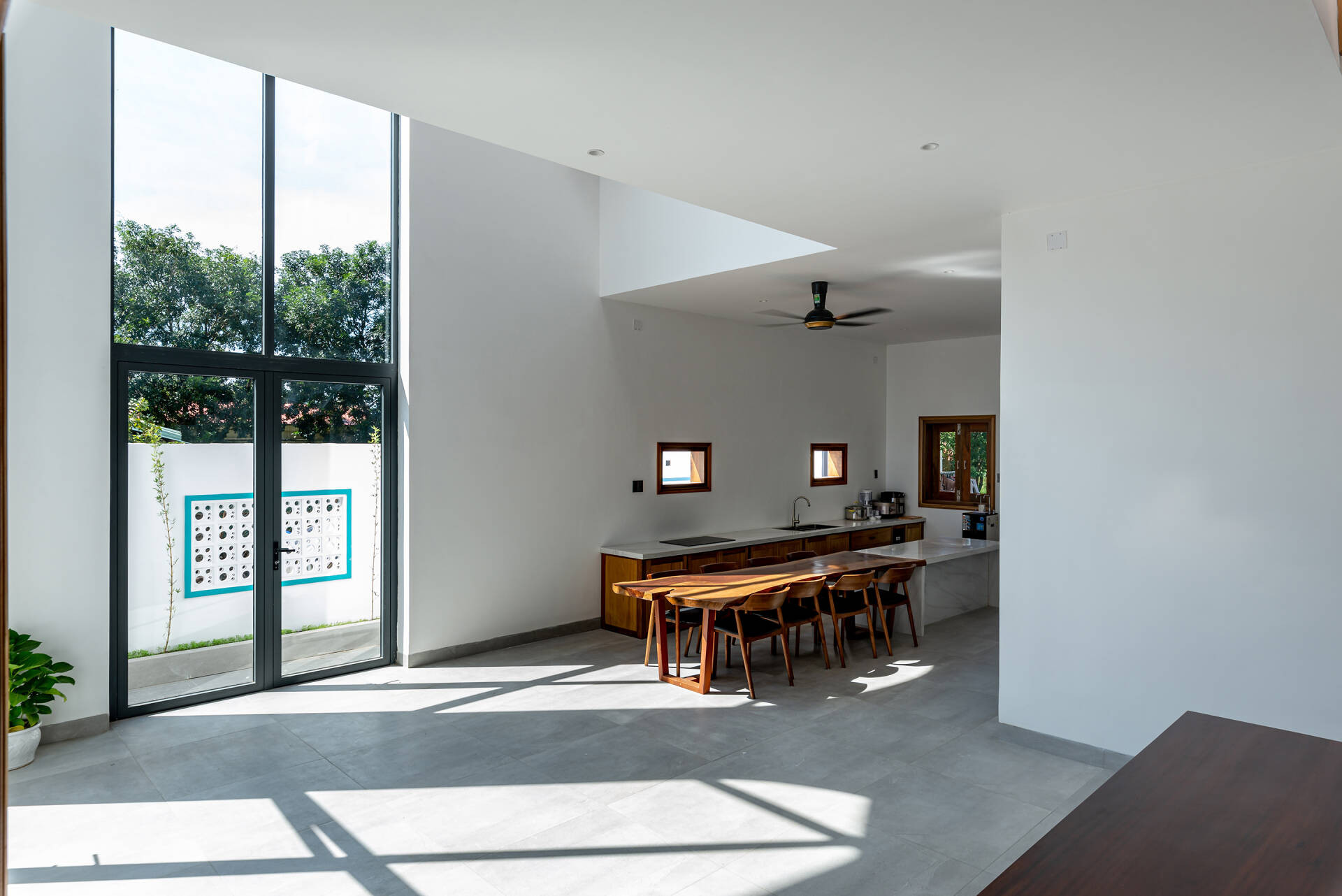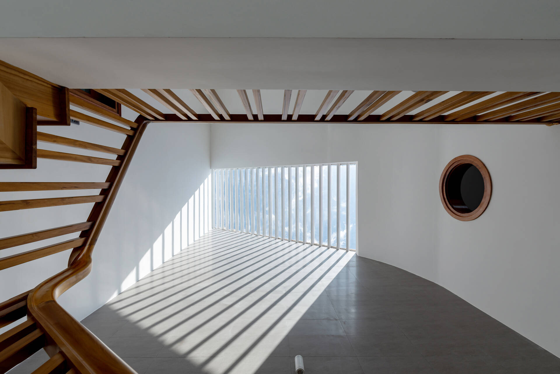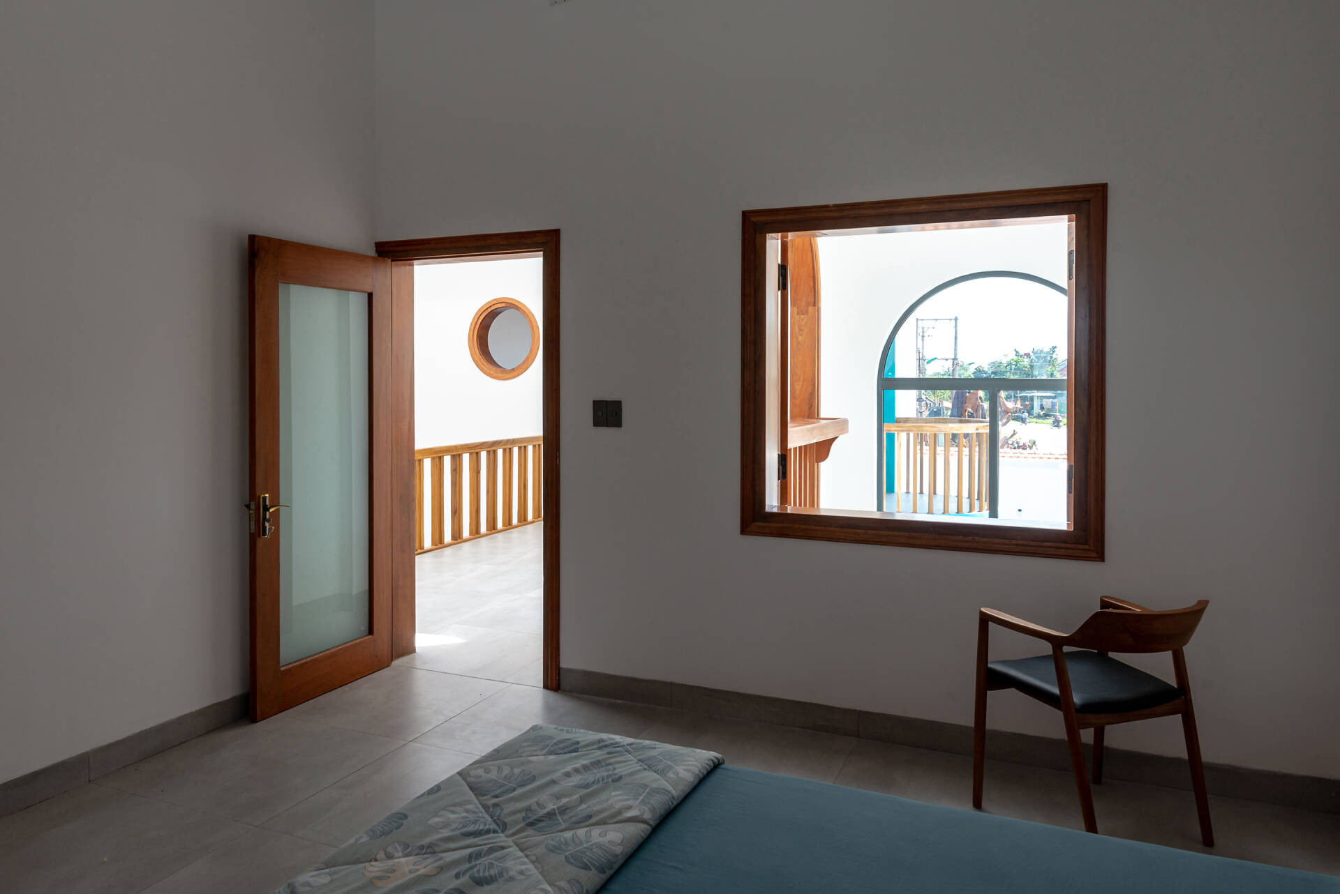 Nội thất của khối nhà chính chủ yếu dùng vật liệu gỗ tự nhiên truyền thống của khu vực địa phương, nhưng được thiết kế đơn giản, hiện đại để không gian nhẹ nhàng và thông thoáng.