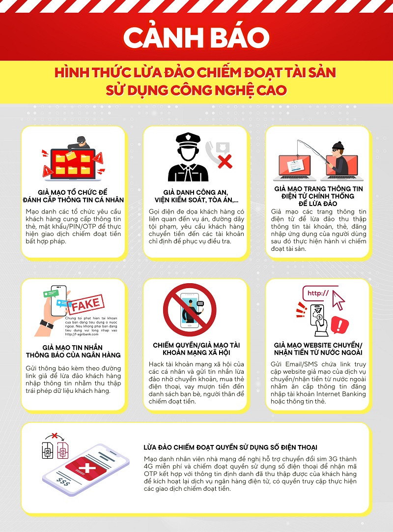 Trước tình hình lừa đảo chiếm đoạt tài sản sử dụng công nghệ cao có nhiều diễn biến phức tạp, Agribank mới đây đã gửi thông tin cảnh báo giúp khách hàng nhận biết nhanh các hình thức lừa đảo phổ biến hiện nay và nâng cao cảnh giác, xây dựng phòng tuyến bảo mật trước các chiêu trò tinh vi.