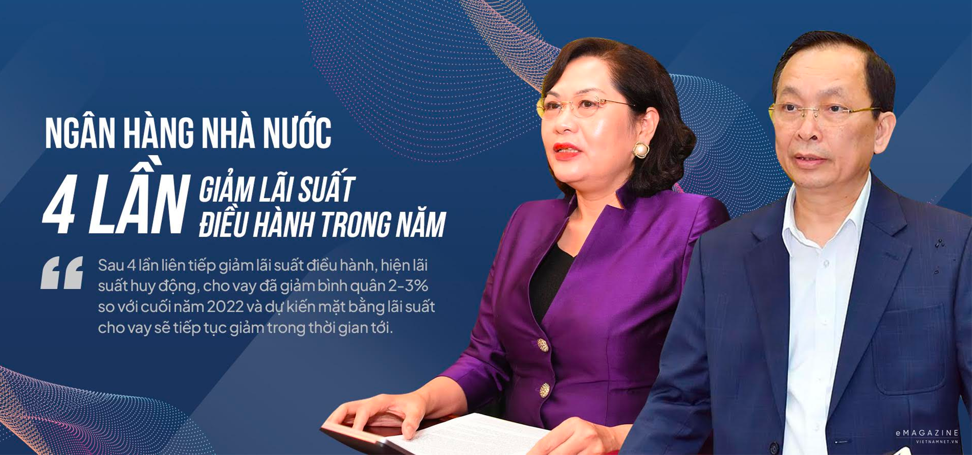 Trong năm 2023, Ngân hàng Nhà nước đã điều hành giảm lãi suất để hỗ trợ, tháo gỡ khó khăn cho nền kinh tế thông qua việc liên tục điều chỉnh giảm 4 lần các mức lãi suất điều hành, với mức giảm 0,5-2,0%/năm, trong bối cảnh lãi suất thế giới tiếp tục tăng và neo ở mức cao; đồng thời, có nhiều văn bản chỉ đạo, trực tiếp làm việc với các tổ chức tín dụng đề nghị tiết giảm chi phí, giảm lãi suất huy động để giảm mặt bằng lãi suất cho vay.