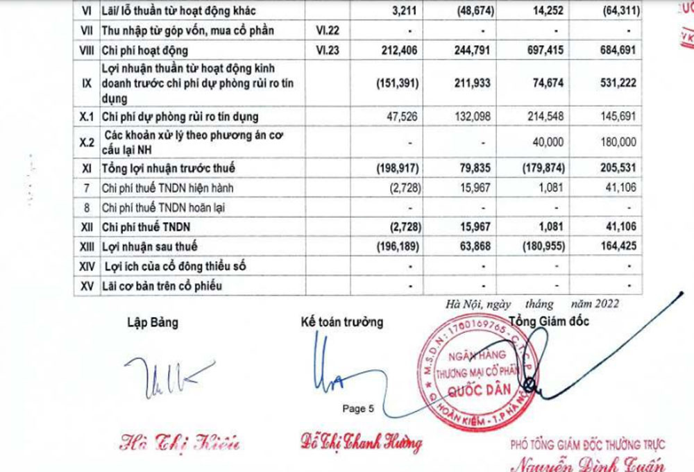 Ngân hàng TMCP Quốc dân - NCB (NVB) vừa công bố báo cáo tài chính quý III/2022 với lợi nhuận sau thuế âm hơn 196 tỷ đồng, trong khi cùng kỳ lãi gần 64 tỷ đồng. Lũy kế 9 tháng, Ngân hàng Quốc dân lỗ gần 181 tỷ đồng, so với mức lãi hơn 164 tỷ đồng cùng kỳ.