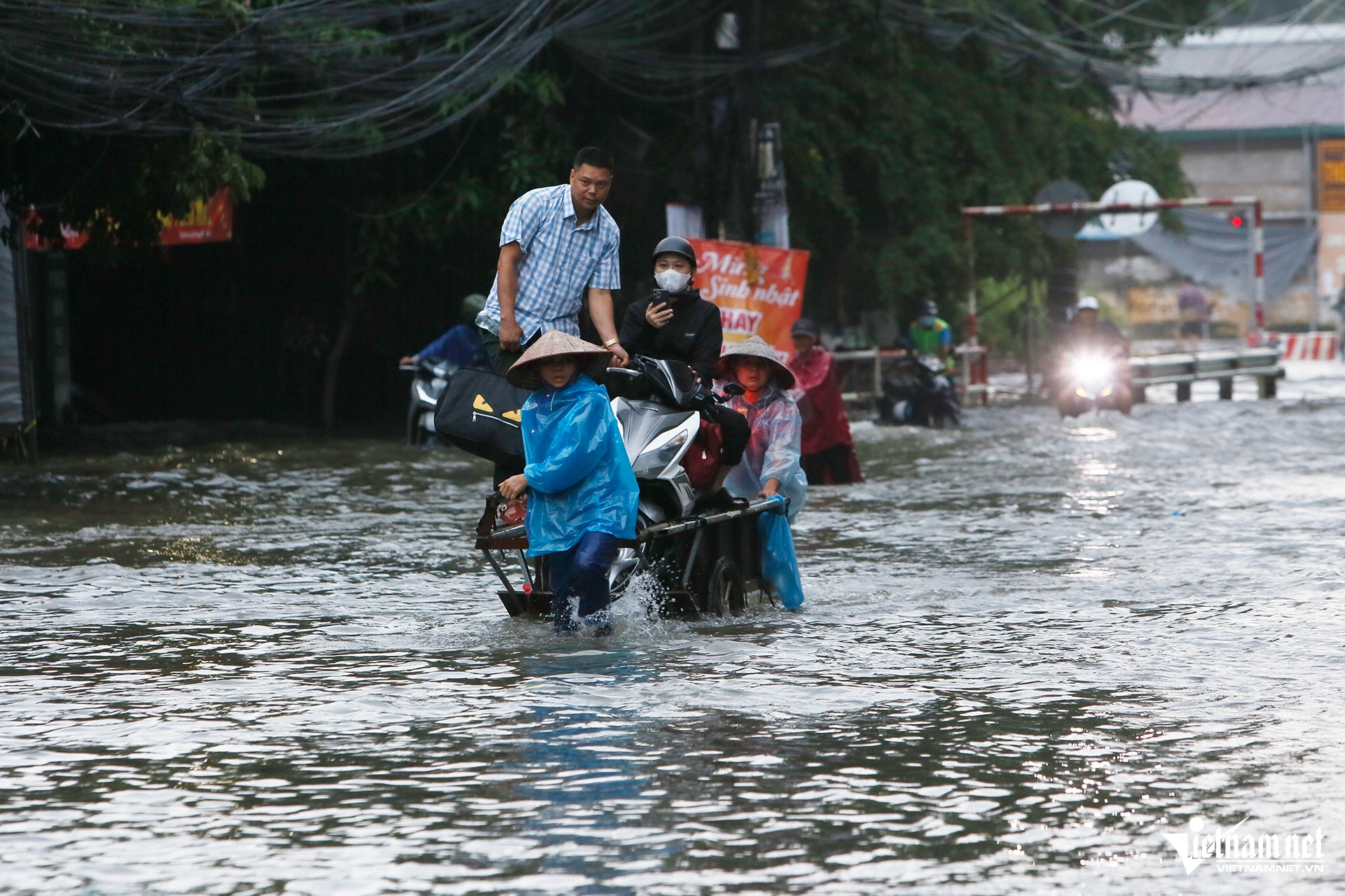 Tại một số khu dân cư lân cận, nước vẫn ngập sâu tới khoảng nửa mét. Dù vậy, nhiều người dân vẫn buộc phải lội qua các điểm ngập để kịp giờ đi làm.