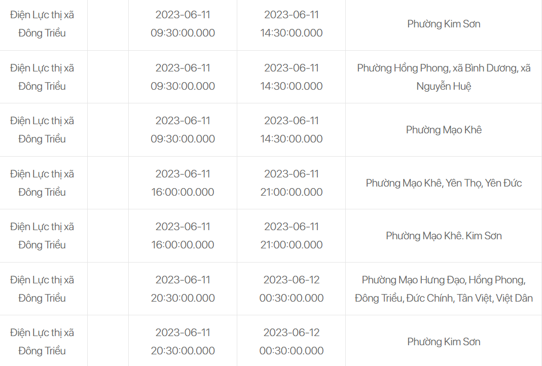 20:30 - 00:30 (ngày 12/6): Phường Mạo Hưng Đạo, Hồng Phong, Đông Triều, Đức Chính, Tân Việt, Việt Dân, Kim Sơn, xã An Sinh, xã Tân Việt