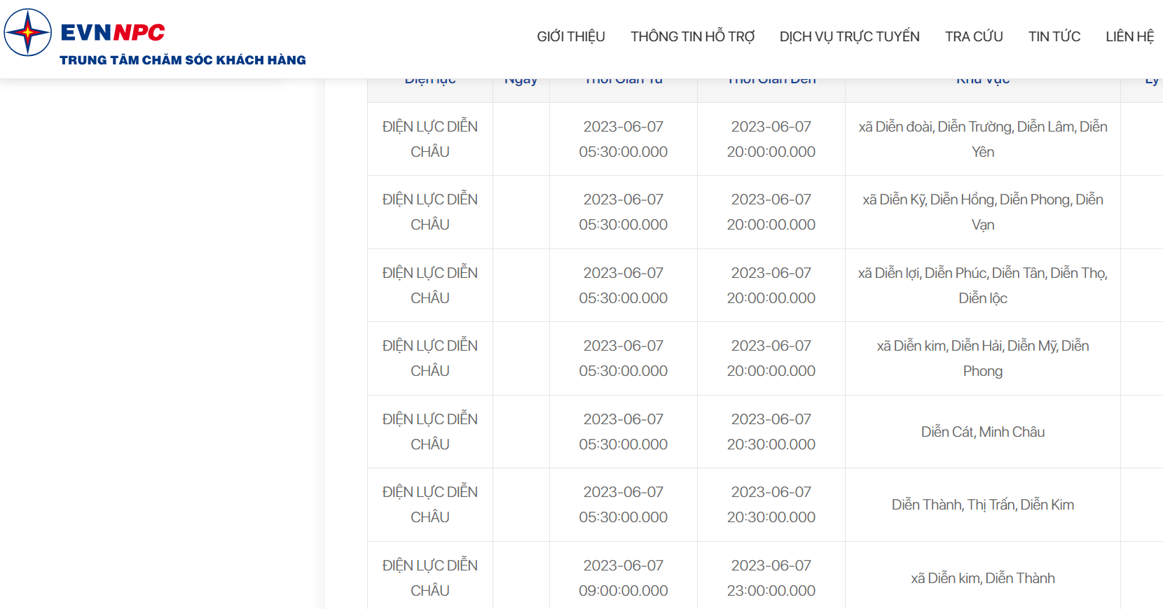 Trong đó, huyện Diễn Châu có nhiều khu vực bị cắt điện trong thời gian dài, có nơi từ 5h30 đến 20h, 9h-23h… Thậm chí, các xã Diễn Phúc, Diễn Nguyên, Diễn Quảng, Diễn Hạnh, Diễn Cát thuộc huyện Diễn Châu cắt điện từ 18h (7/6) đến 2h (8/6).