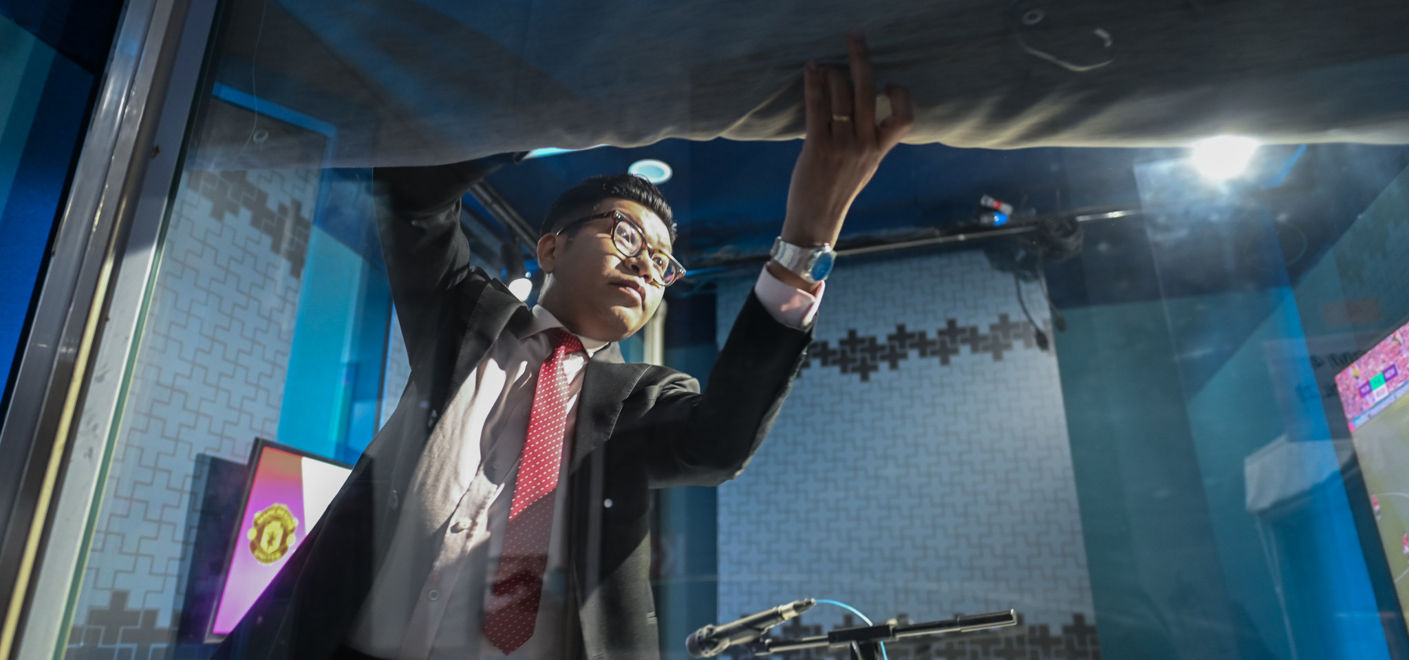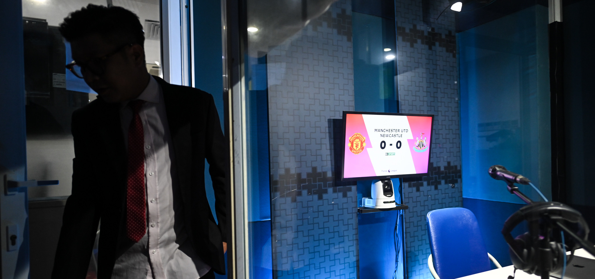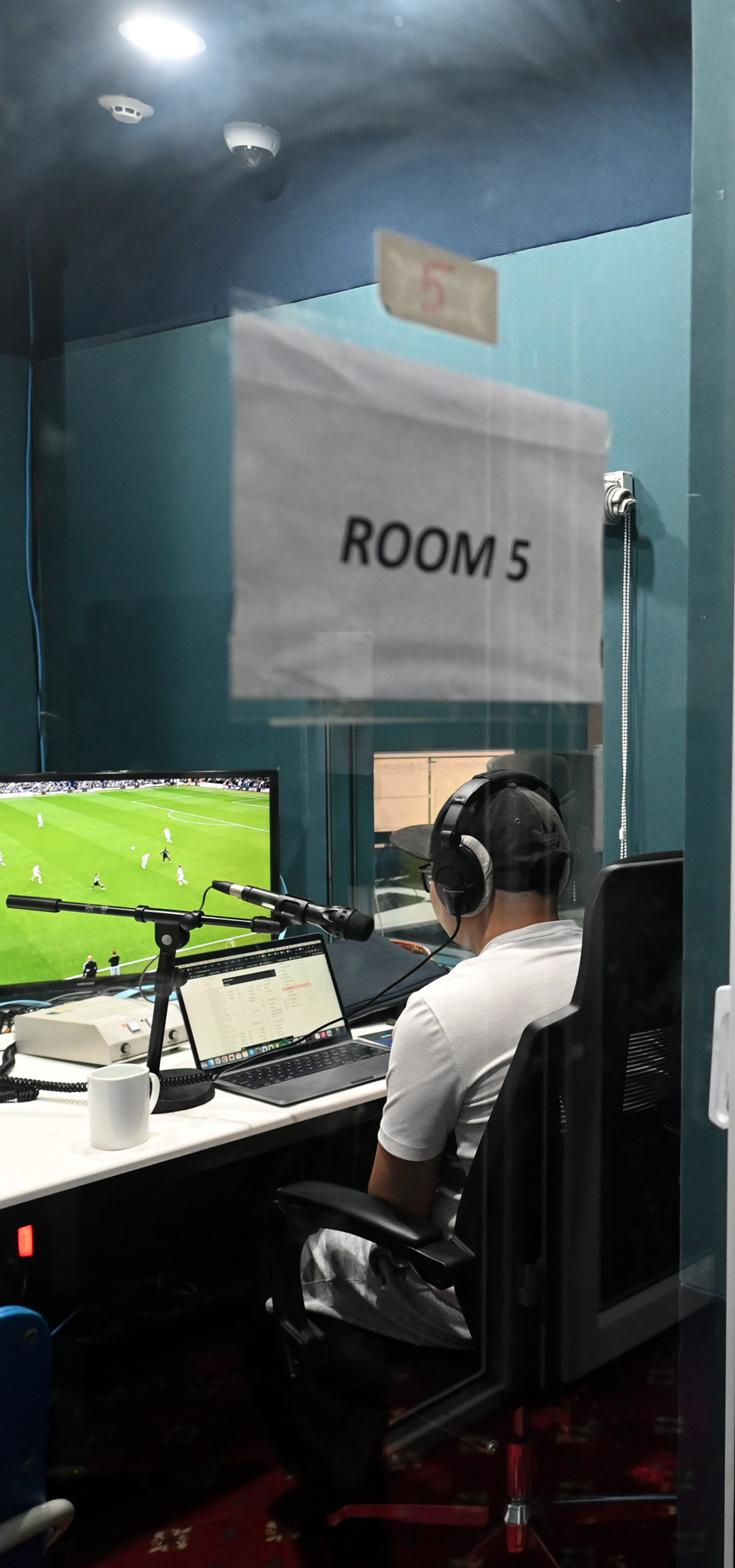 Phòng cabin nhỏ xíu, chỉ kê đủ một chiếc bàn để màn hình tivi, hai chiếc ghế cho cặp đôi bình luận được cách âm hoàn toàn với bên ngoài. Trên bàn, mỗi BLV mang theo một ly nước ấm để giữ giọng trong suốt hai hiệp bóng lăn.