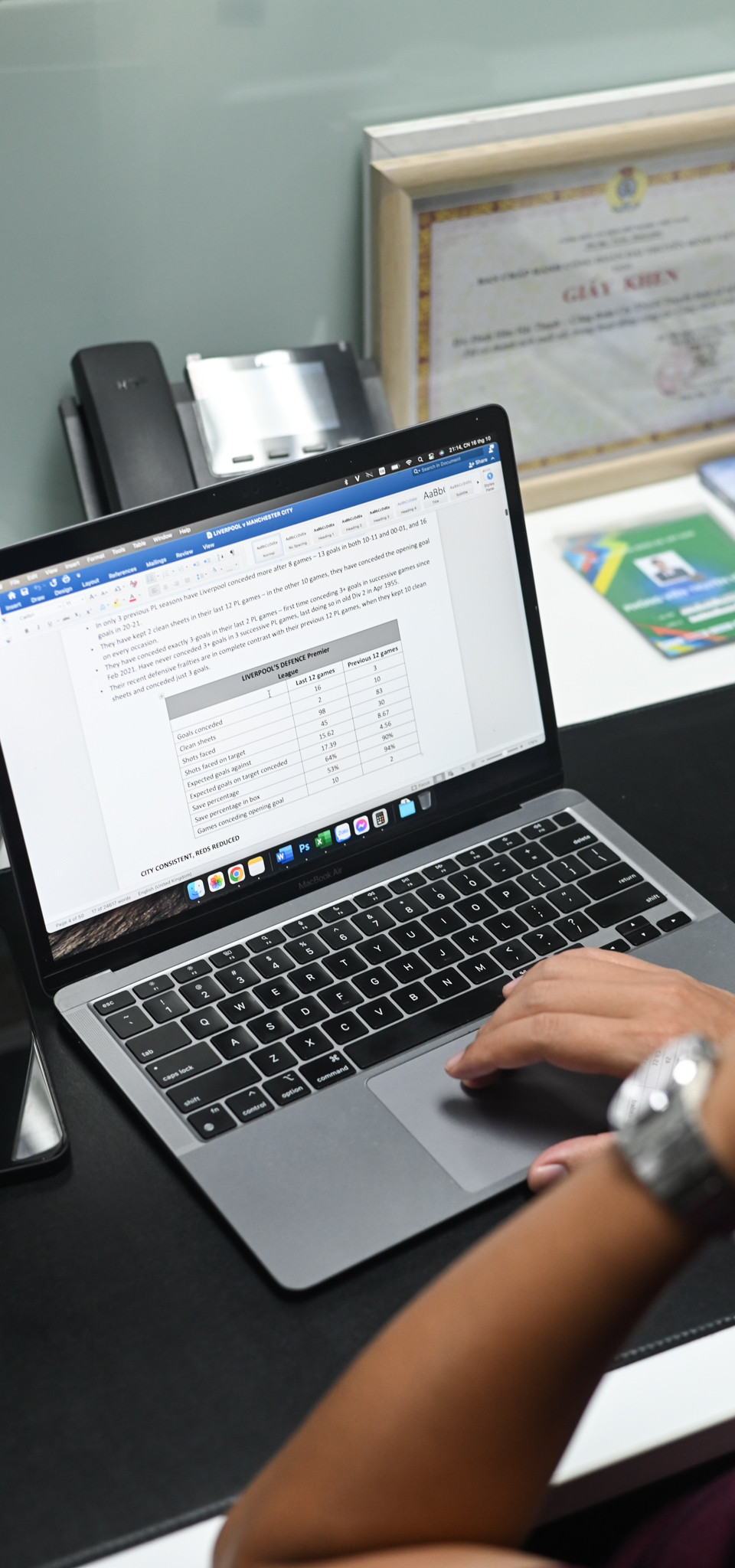 Nghiên cứu sơ đồ trận đấu, điểm tên các cầu thủ có mặt... là thói quen mà BLV Hải Thanh thường làm trong 8 năm gắn bó với nghề. Vừa lướt, anh vừa nhẩm những thông tin hiển thị trên màn hình.