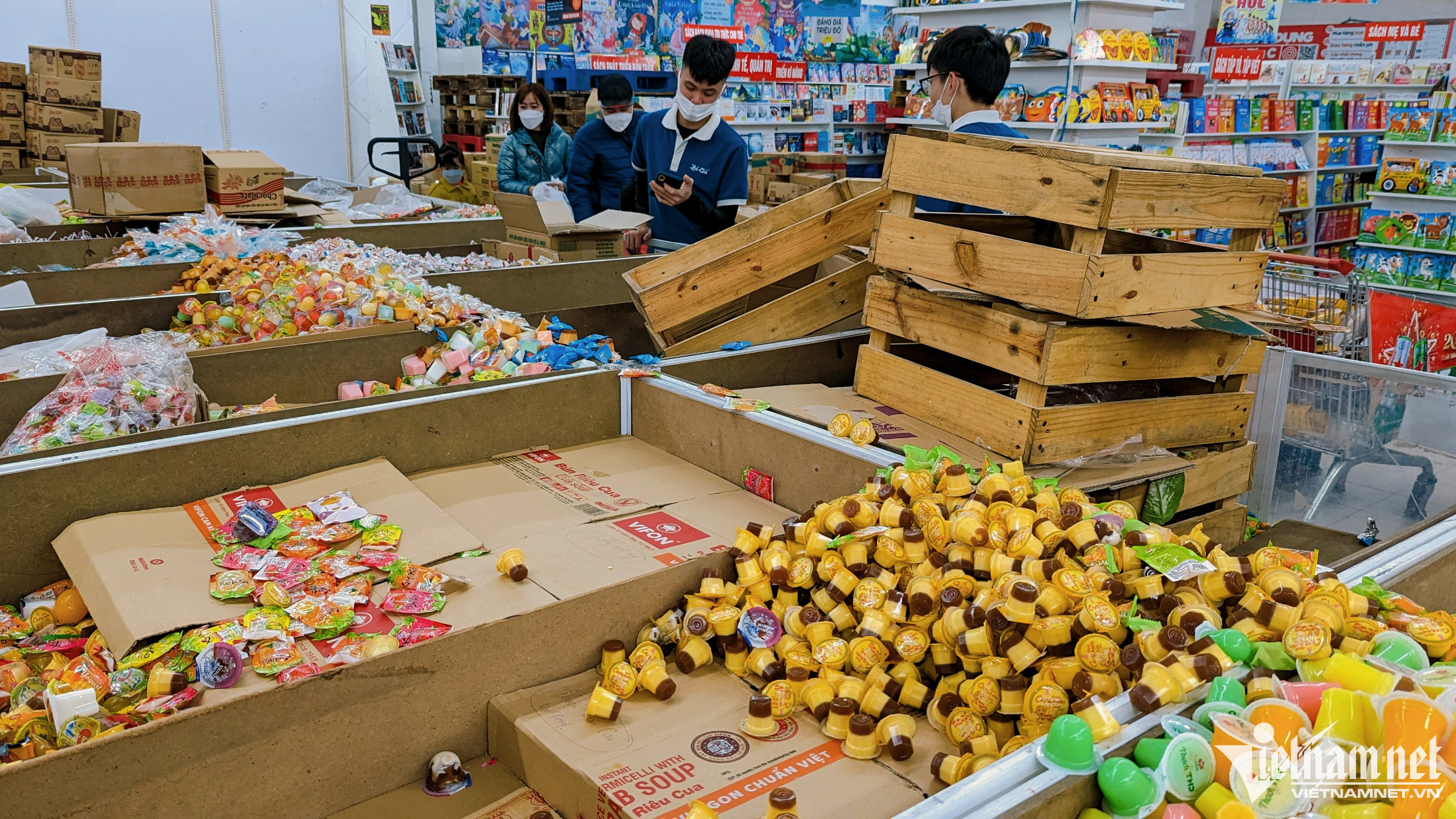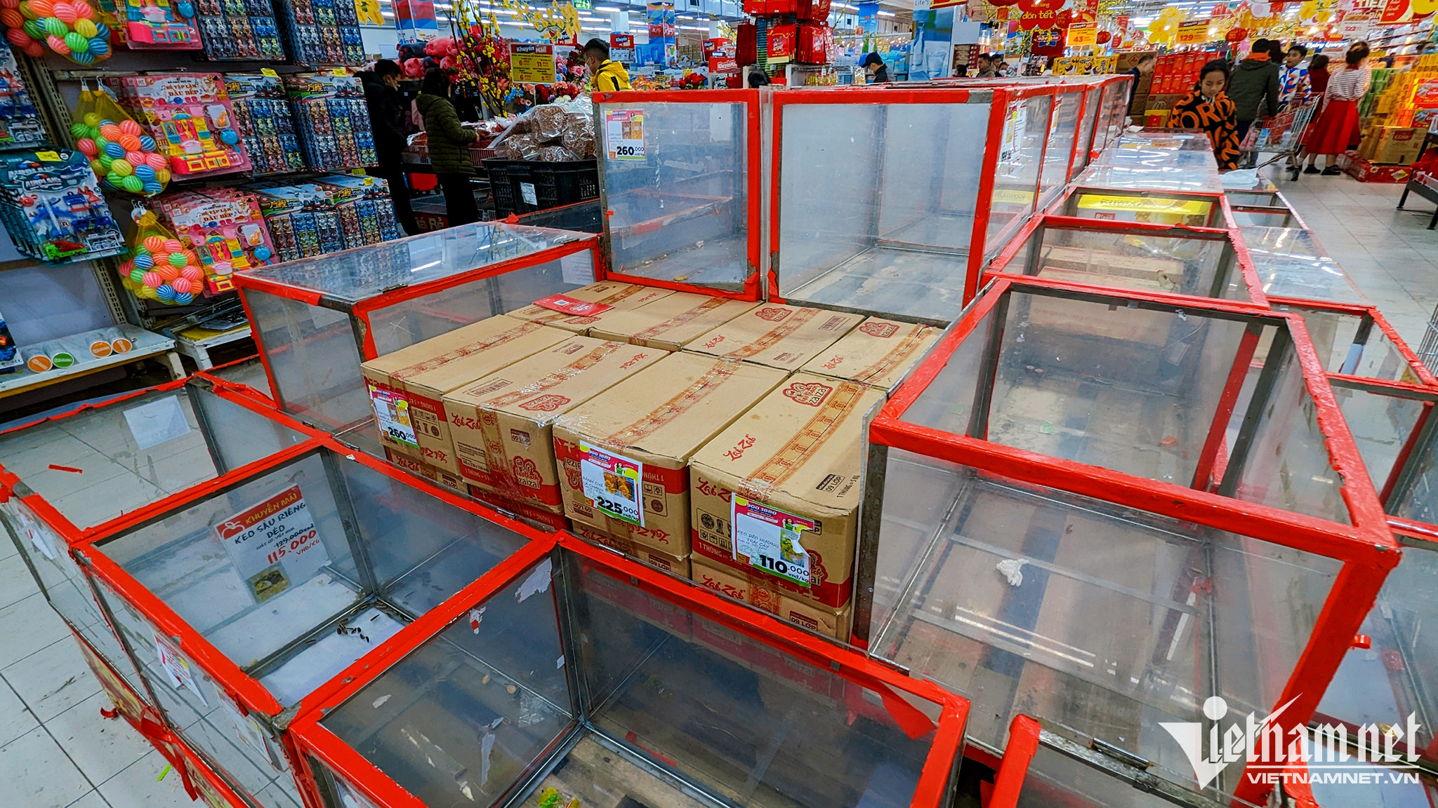 Trước sức mua lớn, gian hàng kẹo, mứt đồ khô bị càn quét hết sạch, chỉ còn lại các thùng rỗng.