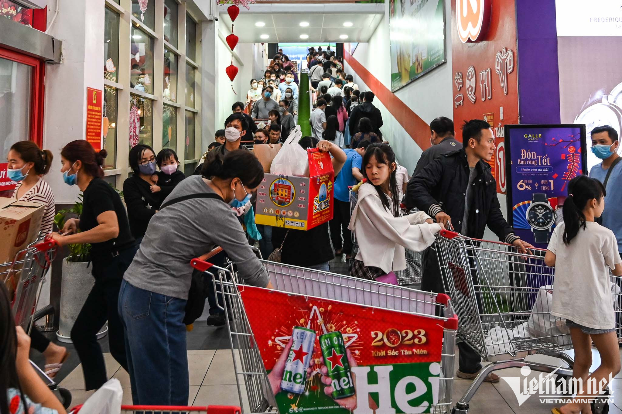 Kết thúc ngày làm việc cuối cùng của năm, với nhiều người đây mới là thời điểm bắt đầu mua sắm Tết. Hành lang lối lên Siêu thị BigC Thăng Long chật kín người. Do khu vực bên trong quá đông, khách hàng phải lấy giỏ, xe chở đồ từ ngoài cửa tầng 1 gần bãi gửi xe đẩy lên để vào trong.