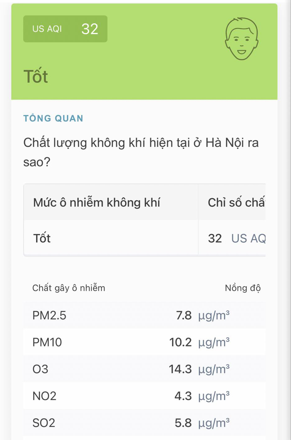 Thông tin trên trang IQAir ghi nhận chỉ số chất lượng không khí của Hà Nội sáng nay ở mức 32-35. Theo bảng chú giải, chỉ số AQI của Hà Nội ở mức xanh - cho thấy chất lượng không khí tốt, không ảnh hưởng tới sức khỏe. Đây là ngưỡng không khí trong lành ngang với các thành phố xanh nổi tiếng khác trên thế giới như Berlin (37), Brussels (36)…