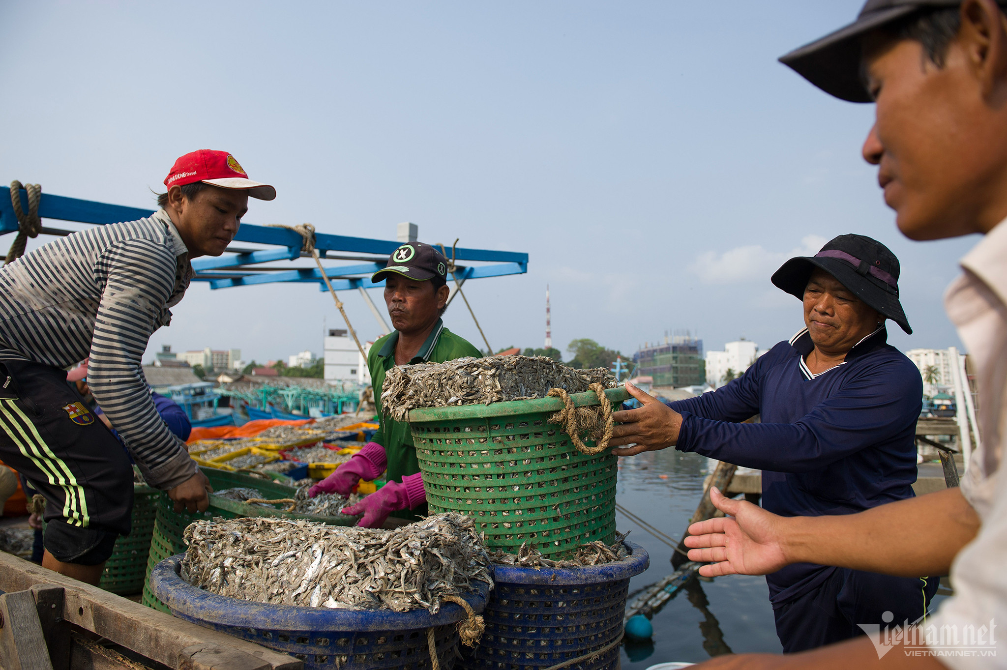 Ngư dân Phú Quốc vận chuyển cá cơm đã ướp muối về nhà thùng.