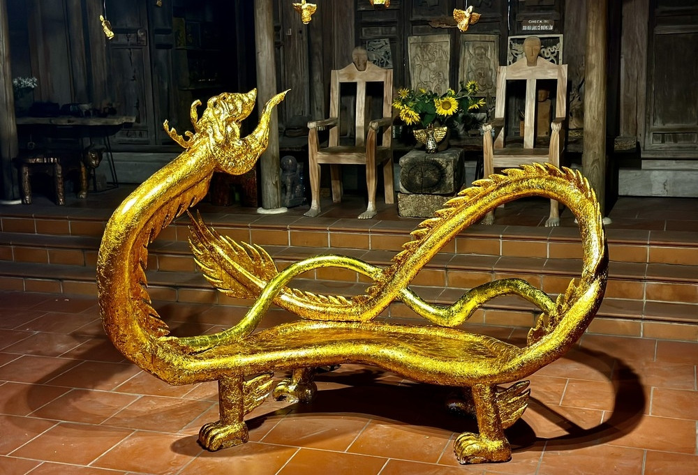 Chiêm ngưỡng ghế rồng dát 2.500 lá vàng giá 2 tỷ đồngĐiểm nhấn trong bộ sưu tập 1.000 hình tượng rồng độc bản của nghệ nhân Nguyễn Tấn Phát là chiếc ghế rồng được dát 2.500 lá vàng, hình con rồng với 5 móng vững chãi và mạnh mẽ.