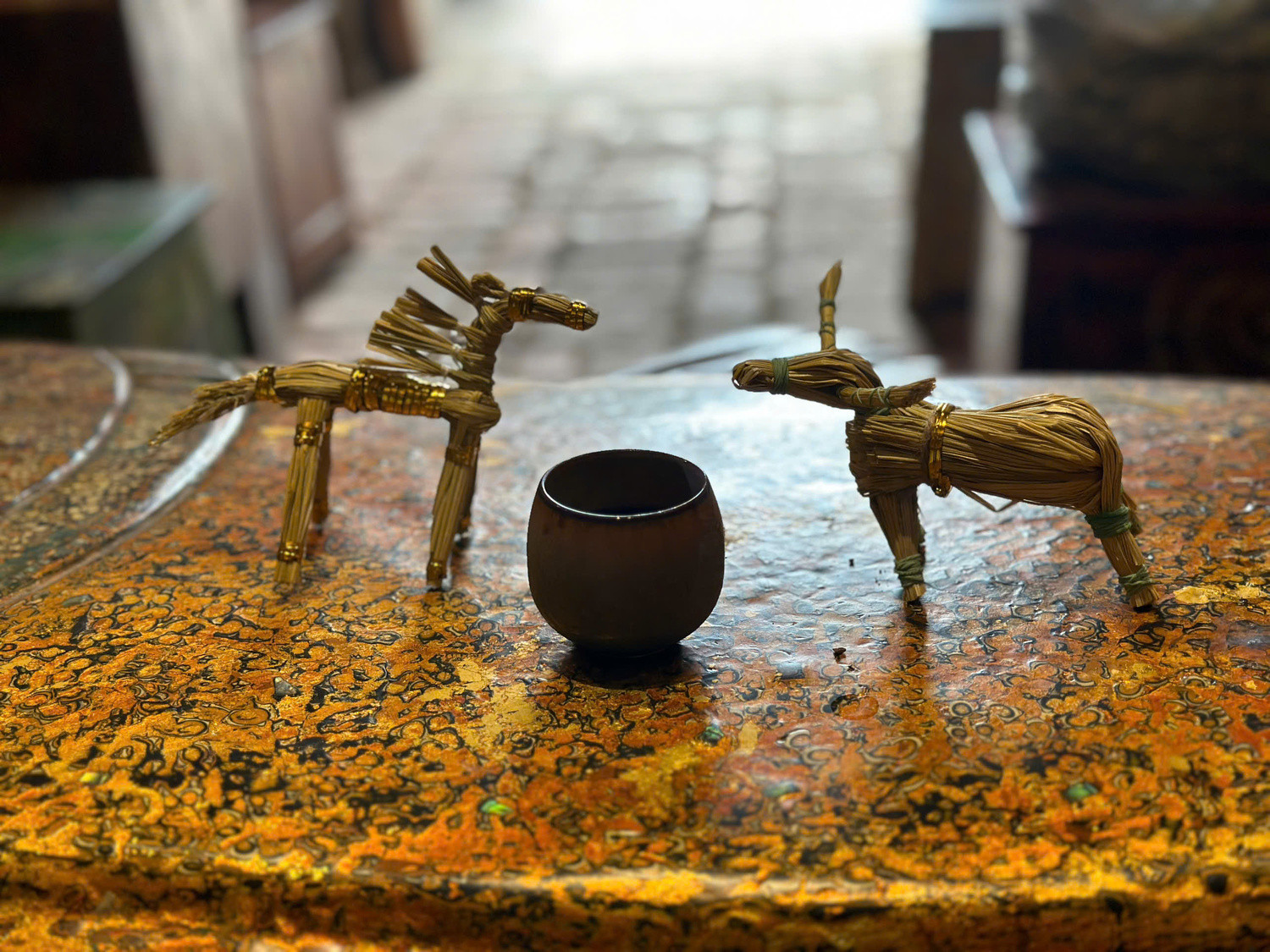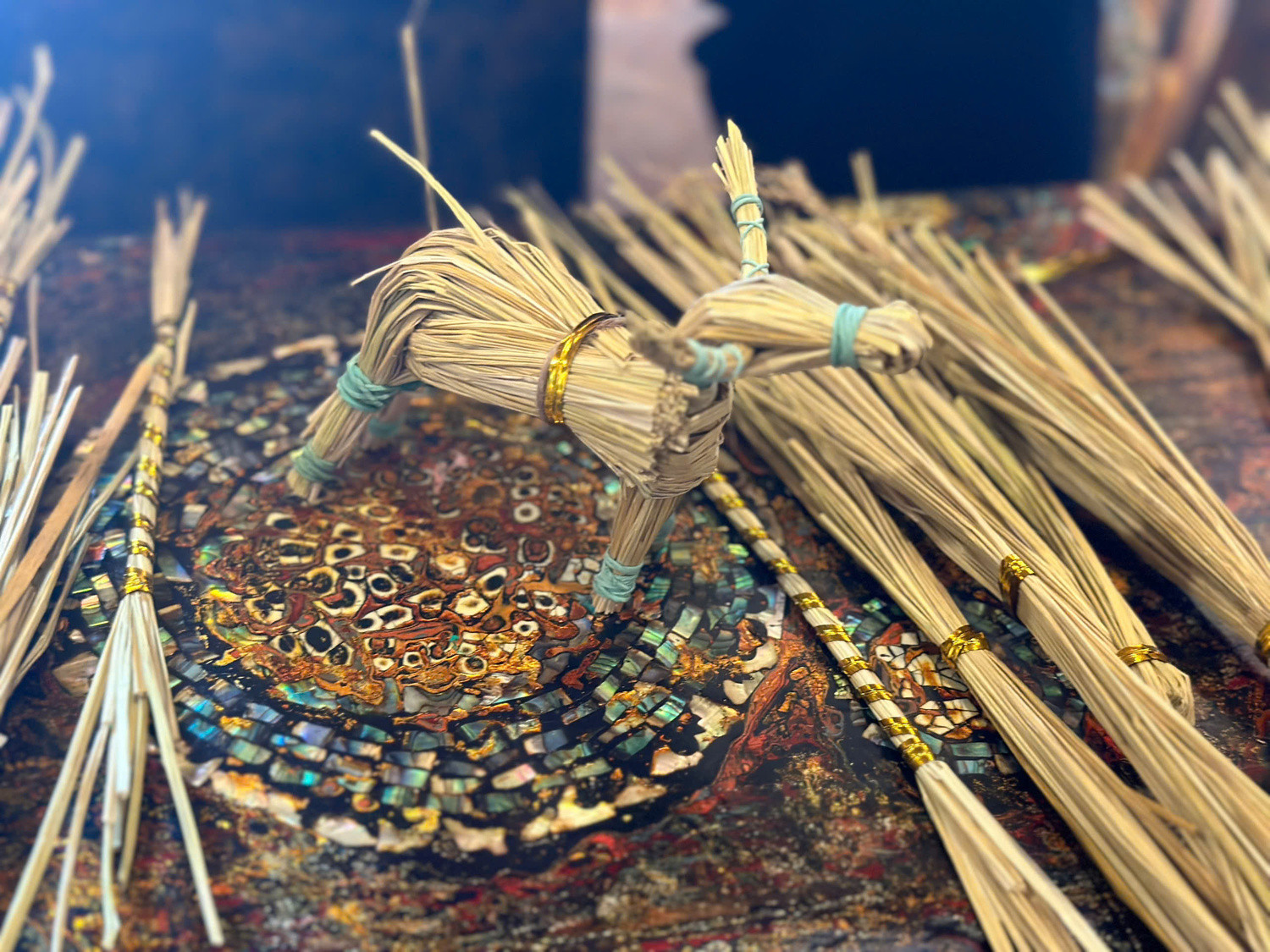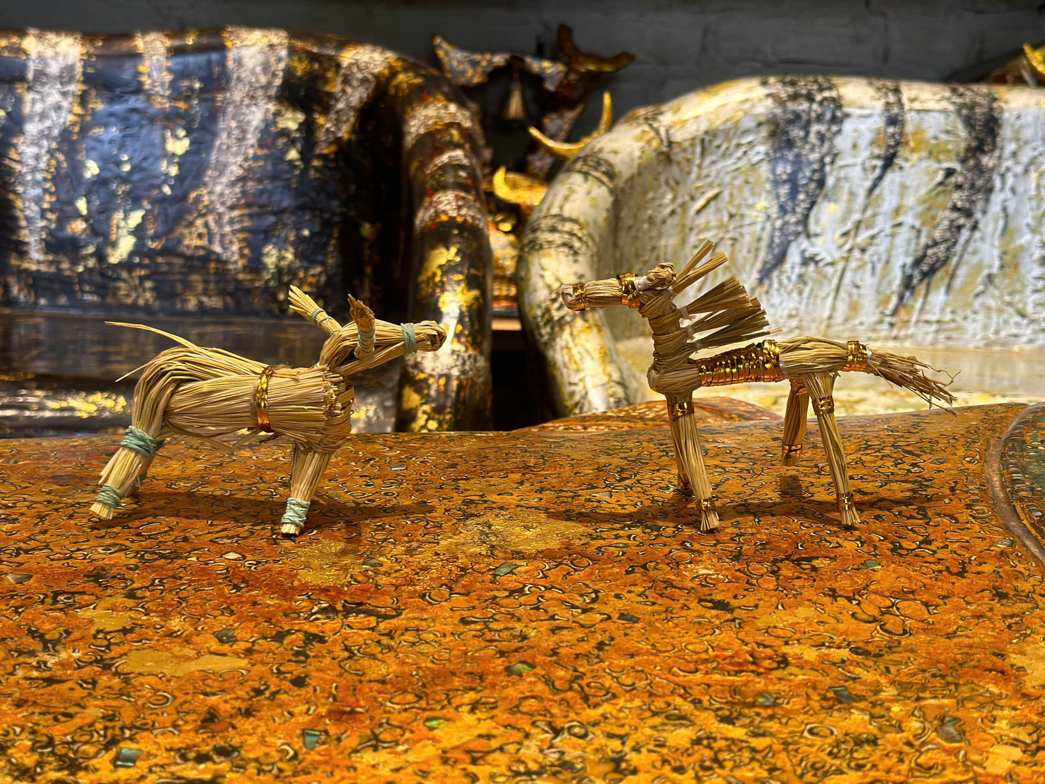 Từ những cọng rơm rạ, nghệ nhân sơn mài Nguyễn Tấn Phát sáng tạo nên các con vật như trâu, ngựa... đầy ấn tượng.
