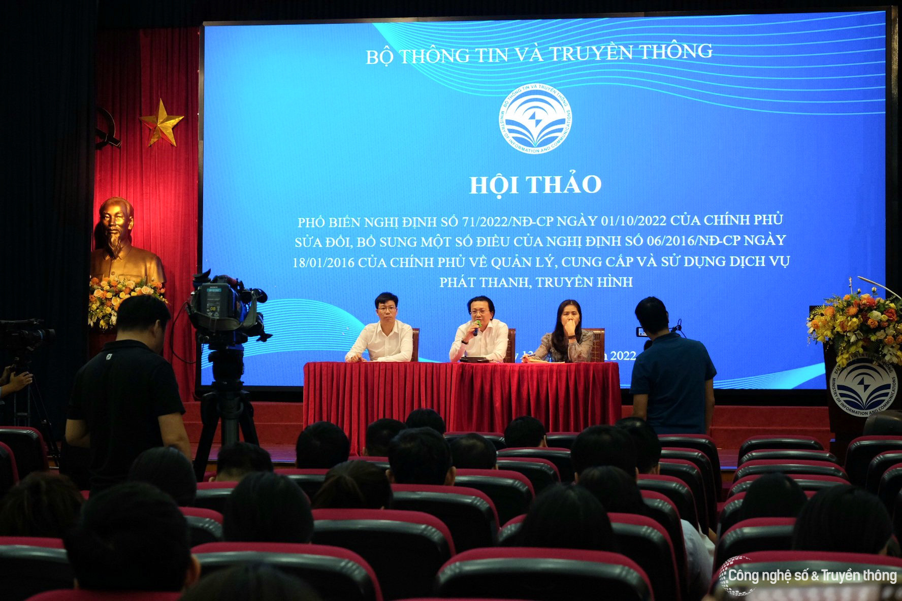 Sáng 13/10, Bộ Thông tin & Truyền thông (TT&TT) đã tổ chức hội thảo phổ biến các điểm mới, điểm chính của Nghị định 71/2022, sửa đổi, bổ sung một số điều của Nghị định 06/2016 về quản lý, cung cấp và sử dụng dịch vụ phát thanh, truyền hình.