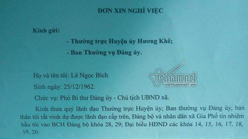 Ông Lê Ngọc Bích, chủ tịch UBND xã Gia Phố, anh trai Chủ tịch huyện Hương Khê bất ngờ có đơn xin nghỉ việc.