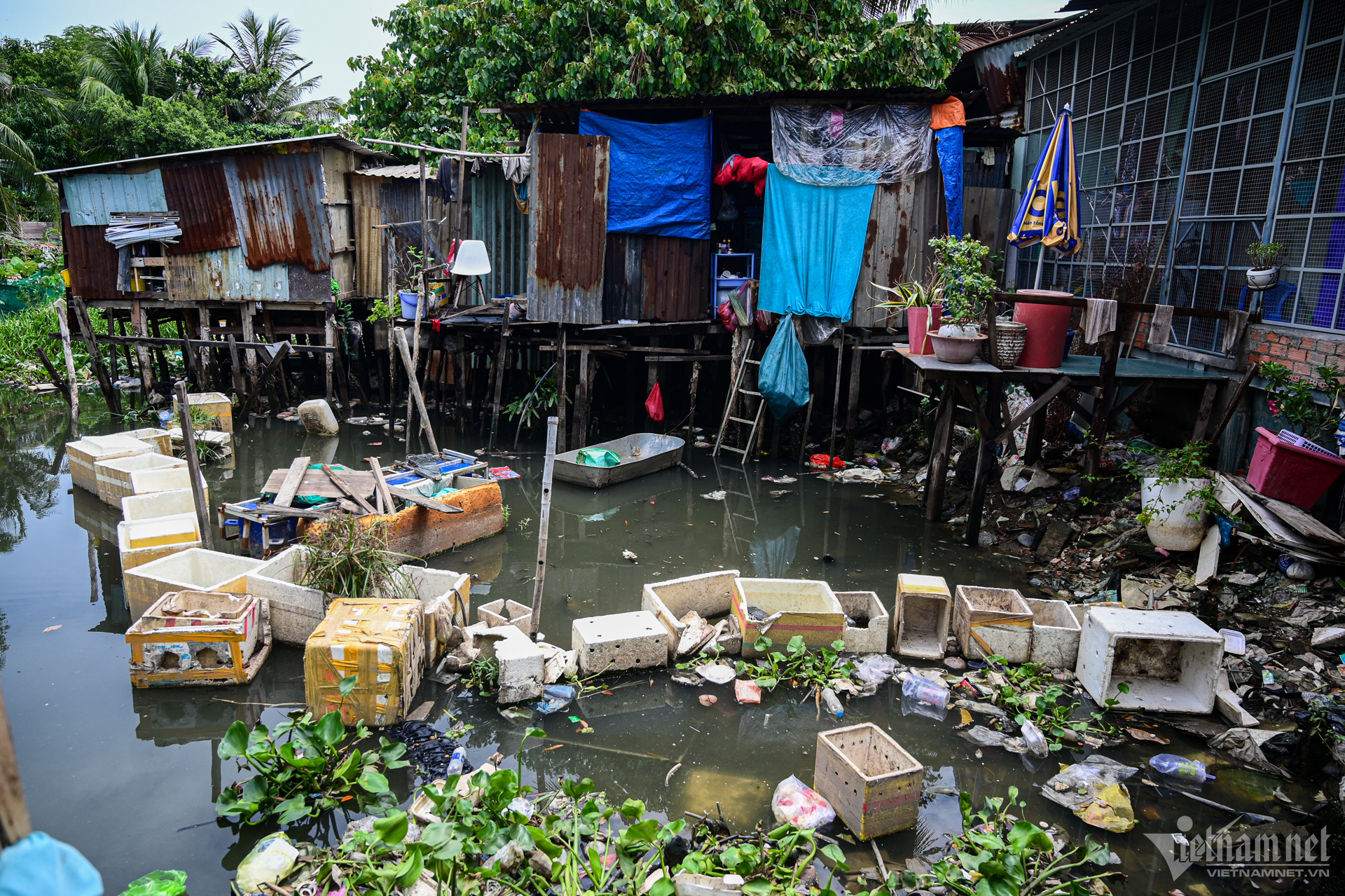 Ngay bên những tòa cao ốc, công trình hiện đại, đồ sộ của thành phố lớn nhất cả nước là khu nhà "ổ chuột" tạm bợ ven rạch Văn Thánh.