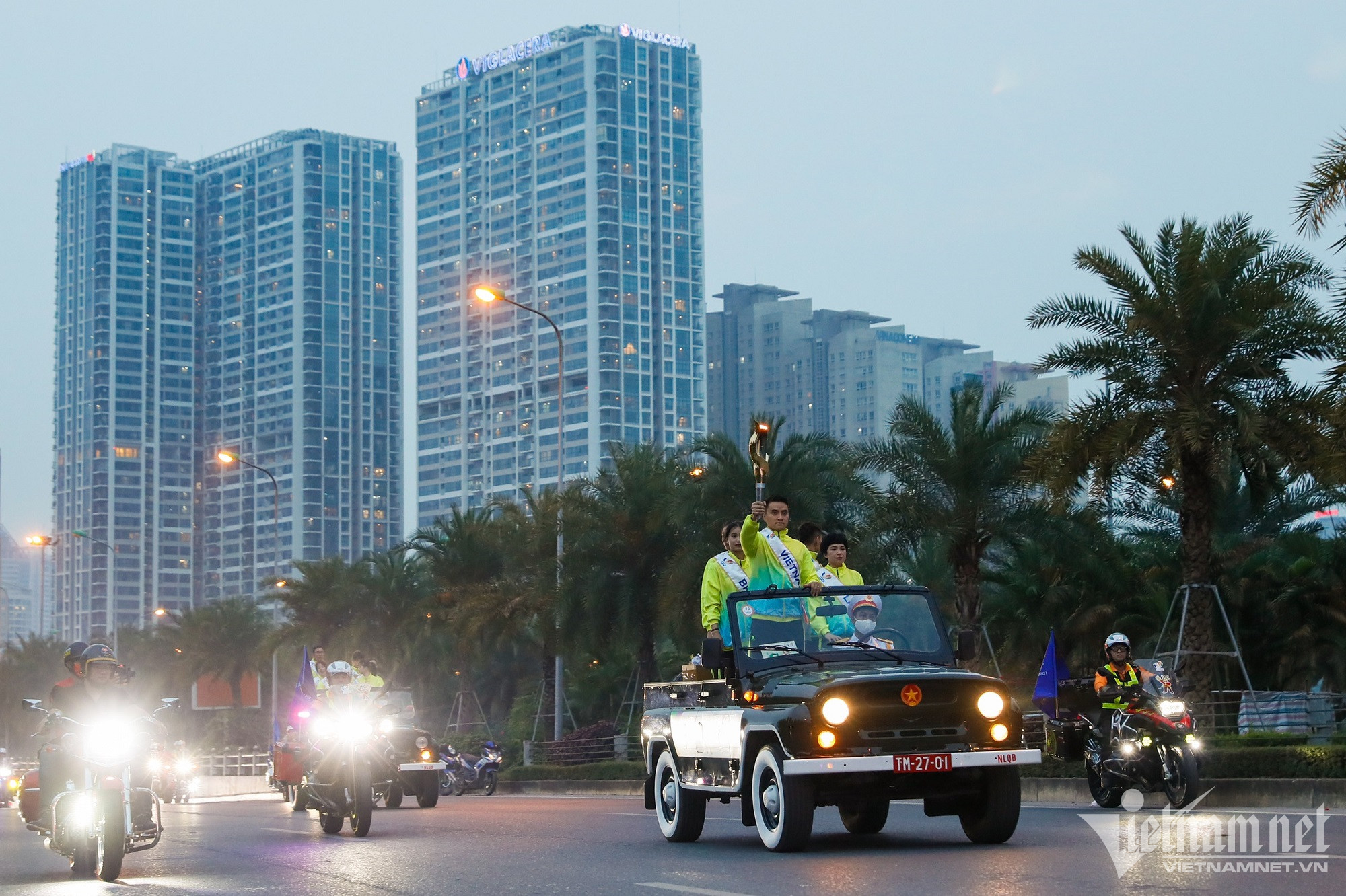 Ghi nhận tại ngã tư Lê Quang Đạo – Mễ Trì, Đội CSGT số 6 ứng trực, chống ùn tắc để đoàn rước đuốc lưu thông thuận lợi.