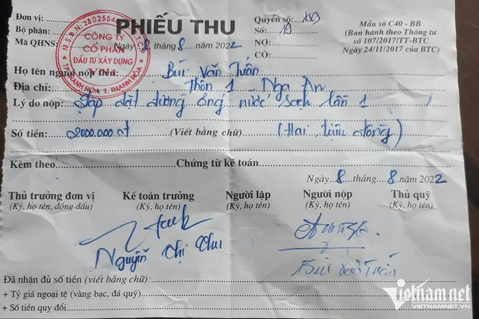 Mới đây, UBND tỉnh Thanh Hóa có văn bản giao cho UBND huyện Nga Sơn, Công ty CP đầu tư xây dựng VN1 làm rõ thông báo khoản thu mà người dân phản ánh, báo cáo chủ tịch UBND tỉnh trước ngày 30/8.