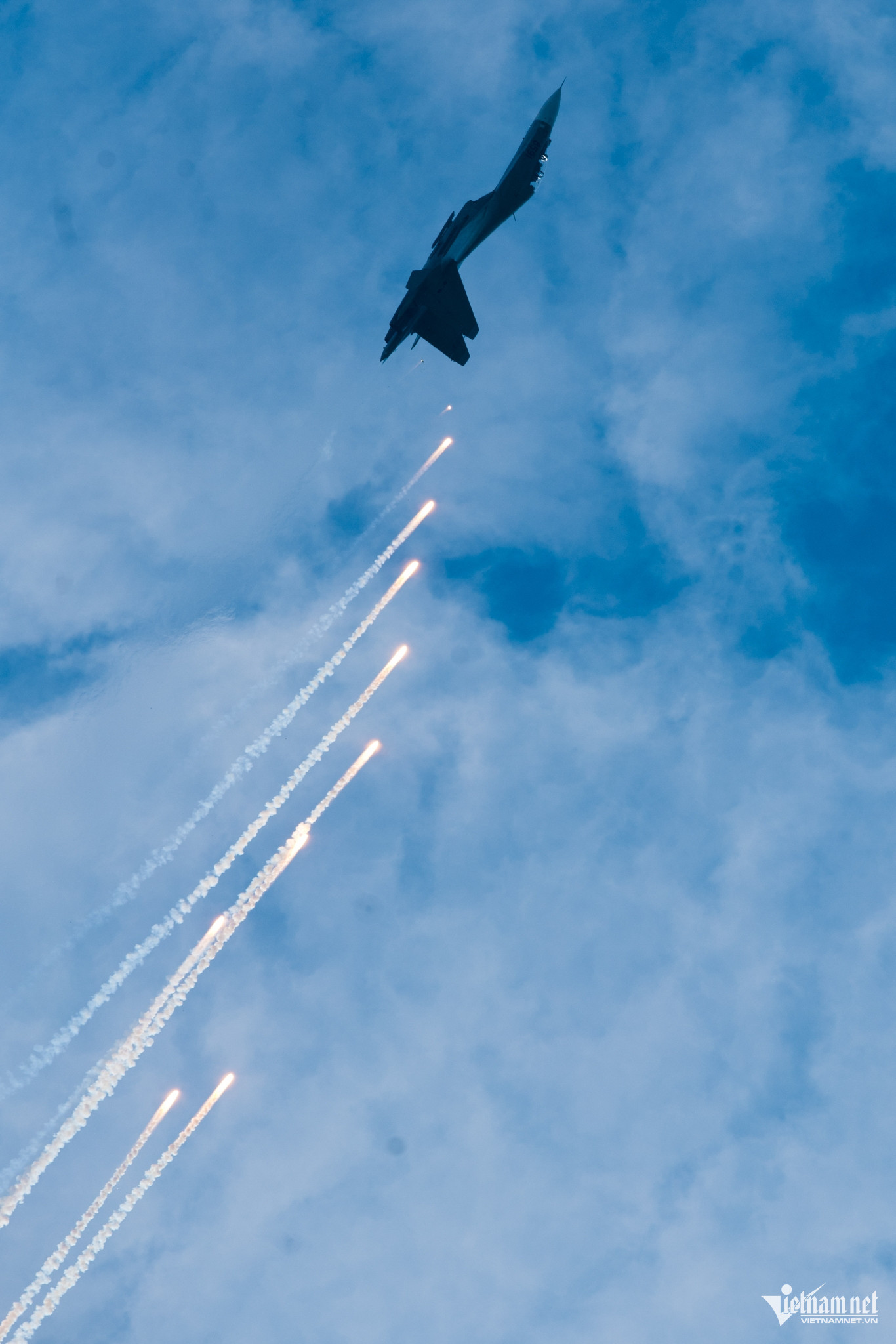 Điểm nhấn trong buổi trình diễn là màn máy bay Su-30MK2 trình diễn xoay vòng thả bẫy mồi đẳng cấp trên bầu trời Hà Nội.