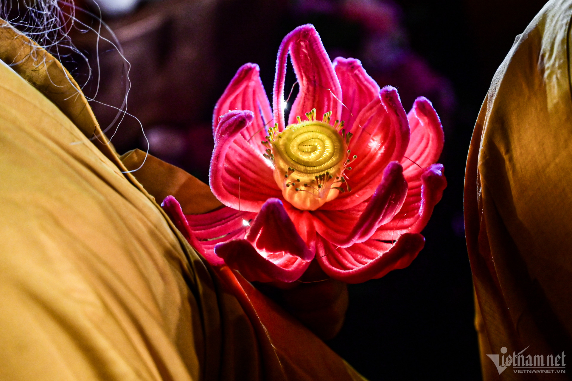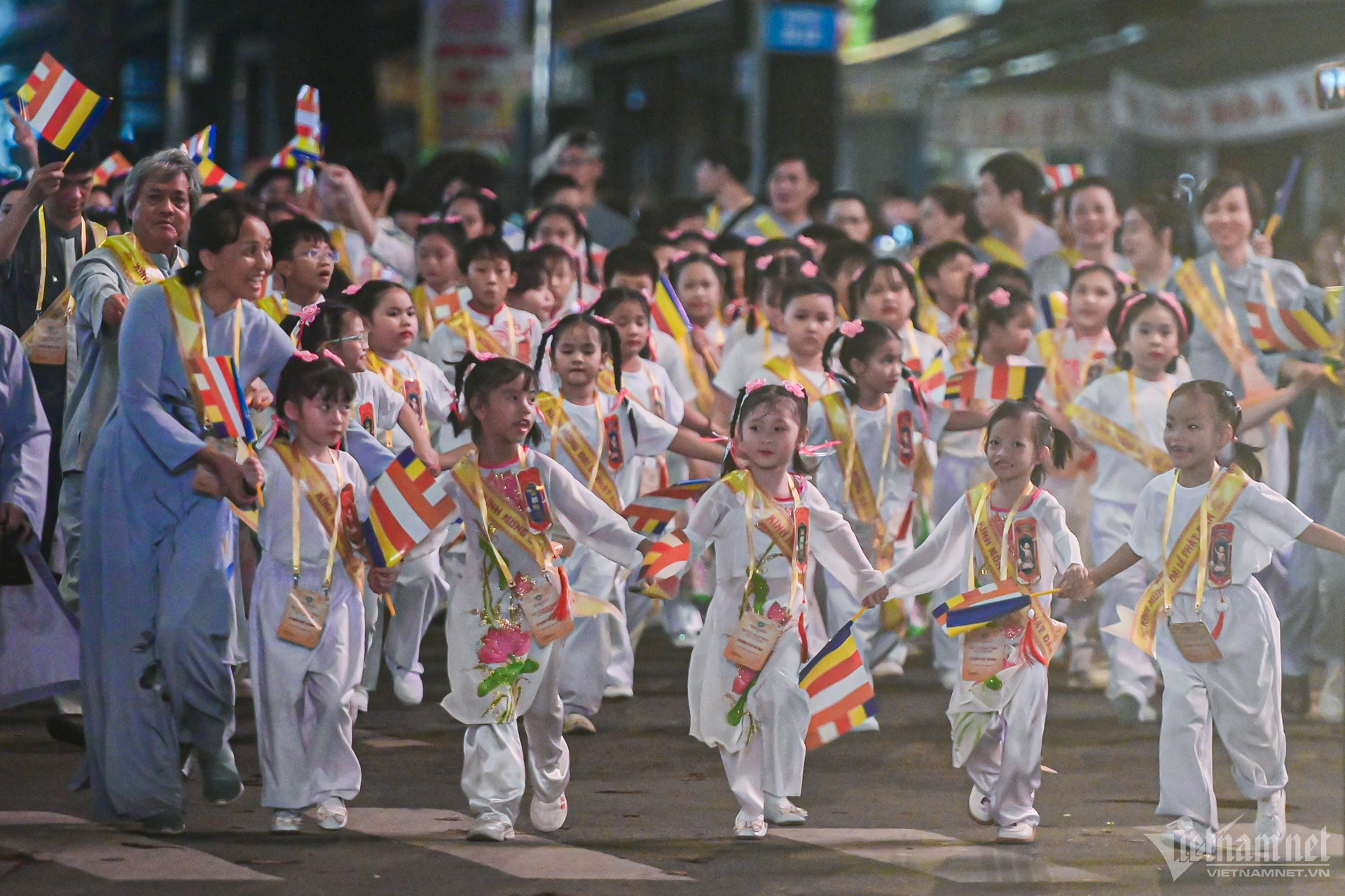 Đoàn kiệu rước tượng Đức Phật đản cùng hơn 20 kiệu hoa của các ban ngành, hệ phái và cơ sở giáo dục Phật giáo TP.HCM với màu sắc và chủ đề phong phú được rước từ chùa Ấn Quang về Việt Nam Quốc Tự (quận 10) với chặng đường khoảng 1km, tối 15/5.