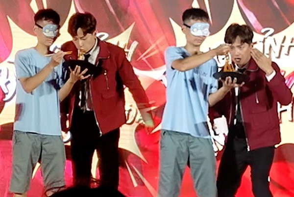 Ngô Kiến Huy, JSol và Cara cùng 3 khán giả tham gia trò chơi ăn mì ở sự kiện ẩm thực tại TP.HCM.