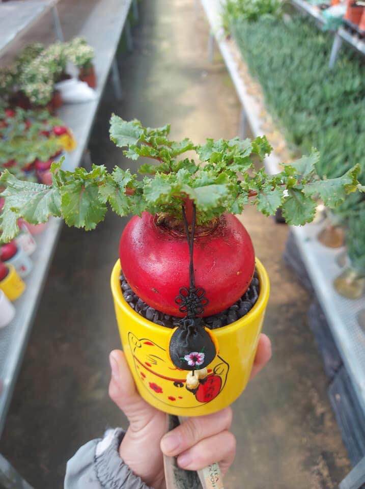 Vốn là loại rau ăn hàng ngày nhưng gần đây, củ cải đỏ được nhà vườn trồng trên chậu như một loại bonsai trưng Tết. Ảnh: Facebook