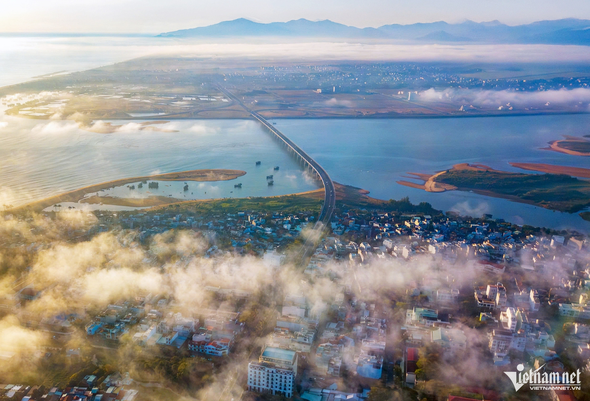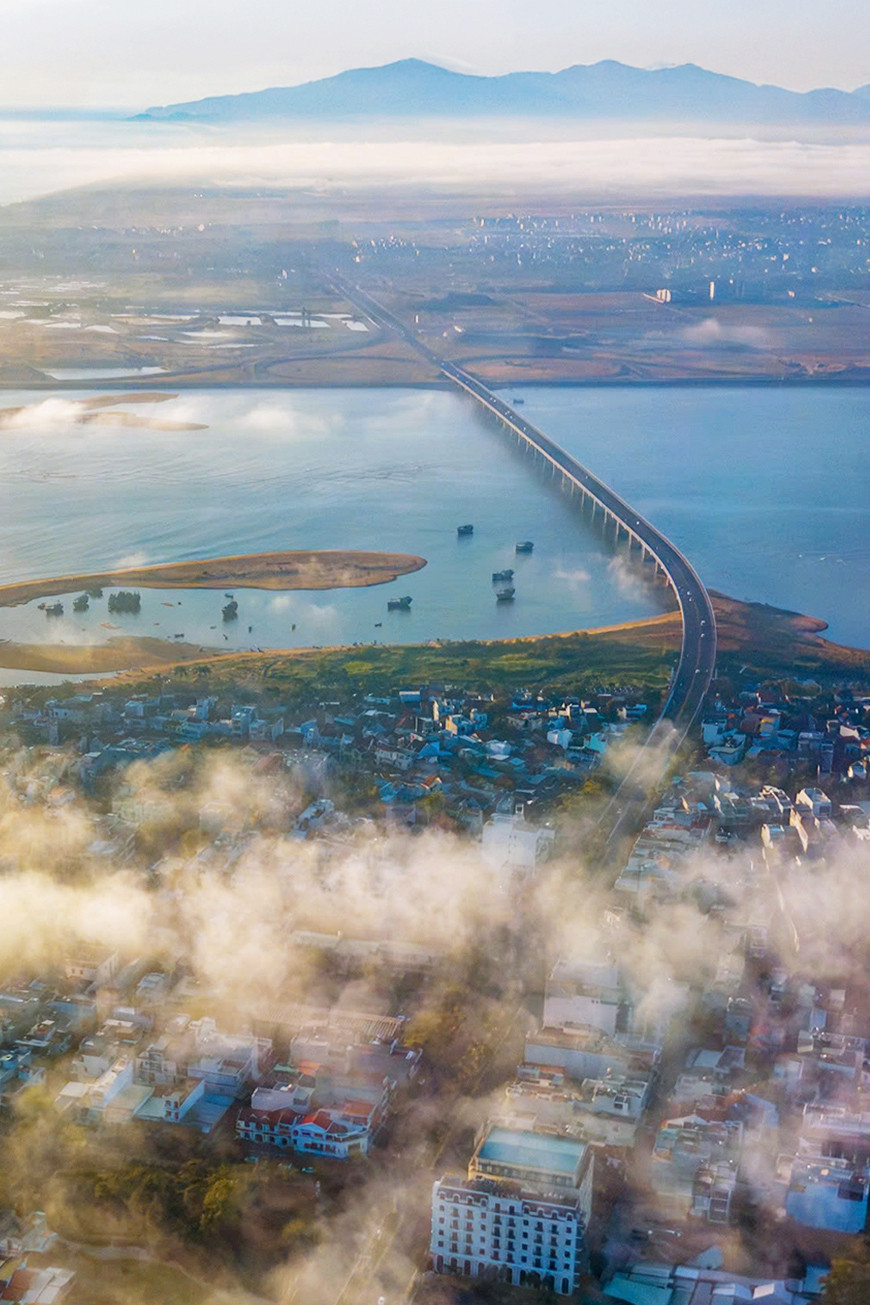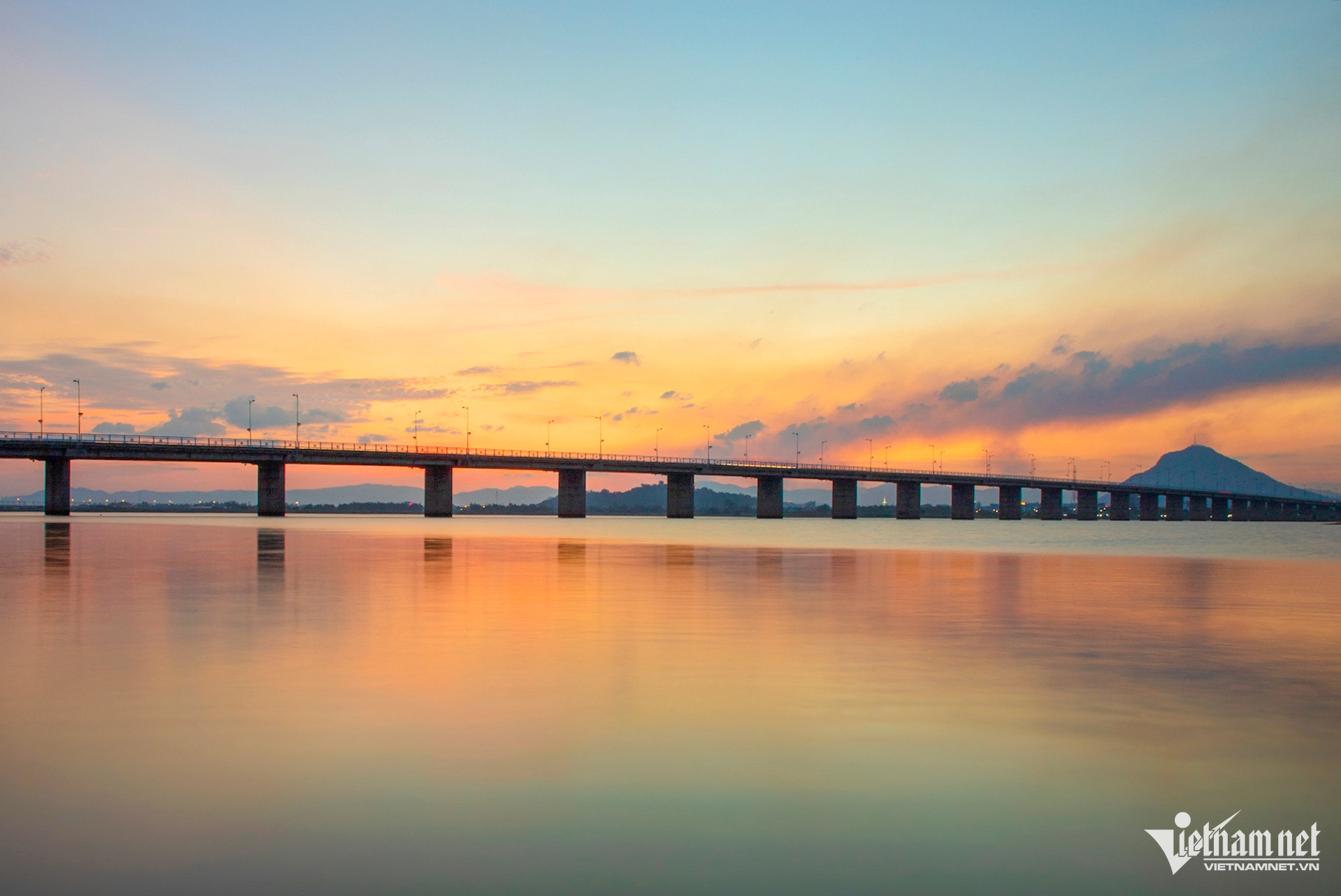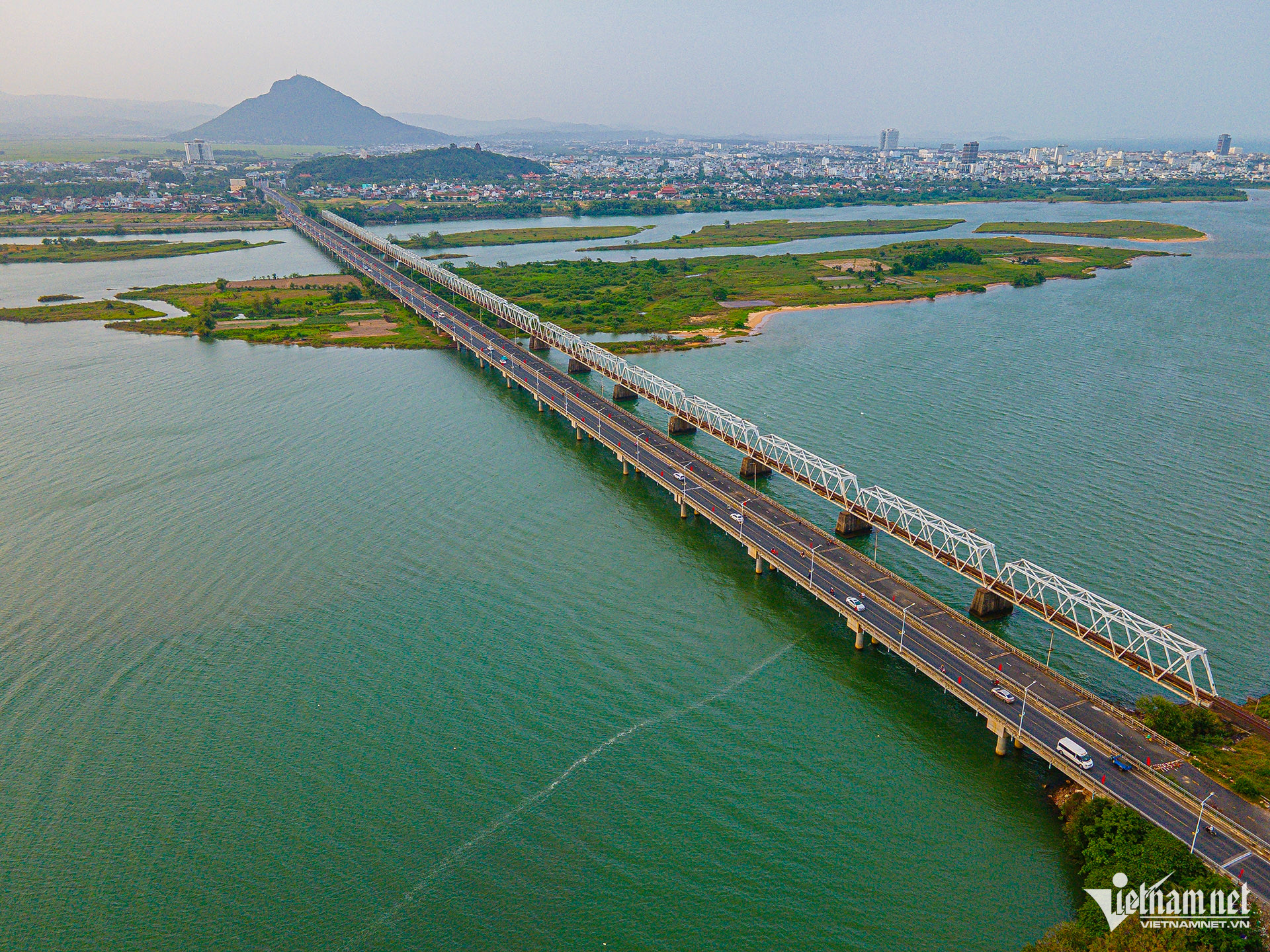 Trong ảnh, hệ thống 3 cầu bắc qua sông Đà Rằng, gồm 1 cầu đường sắt được xây dựng từ thời Pháp và 2 cầu đường bộ. Cầu mới được khánh thành năm 2019, tổng chiều dài gần 1,6km, tổng mức đầu tư 340 tỷ đồng. Trong đó, phần cầu có chiều dài gần 1,2km, được thiết kế vĩnh cửu, mặt cầu rộng 10,5m.
