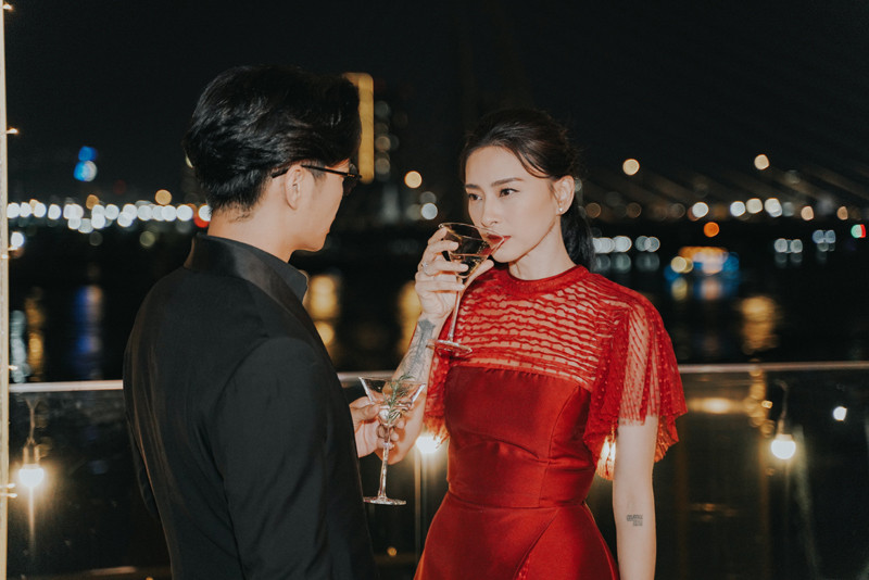 Mở đầu trải nghiệm “ẩm thực hàng hiệu” là tiệc nhẹ khai vị tại khu vực ngoài trời của nhà hàng River Deck. Trong không gian âm nhạc đương đại, Ngô Thanh Vân và Huy Trần có dịp thưởng thức cocktail và cùng ngắm khung cảnh sông Sài Gòn về đêm.