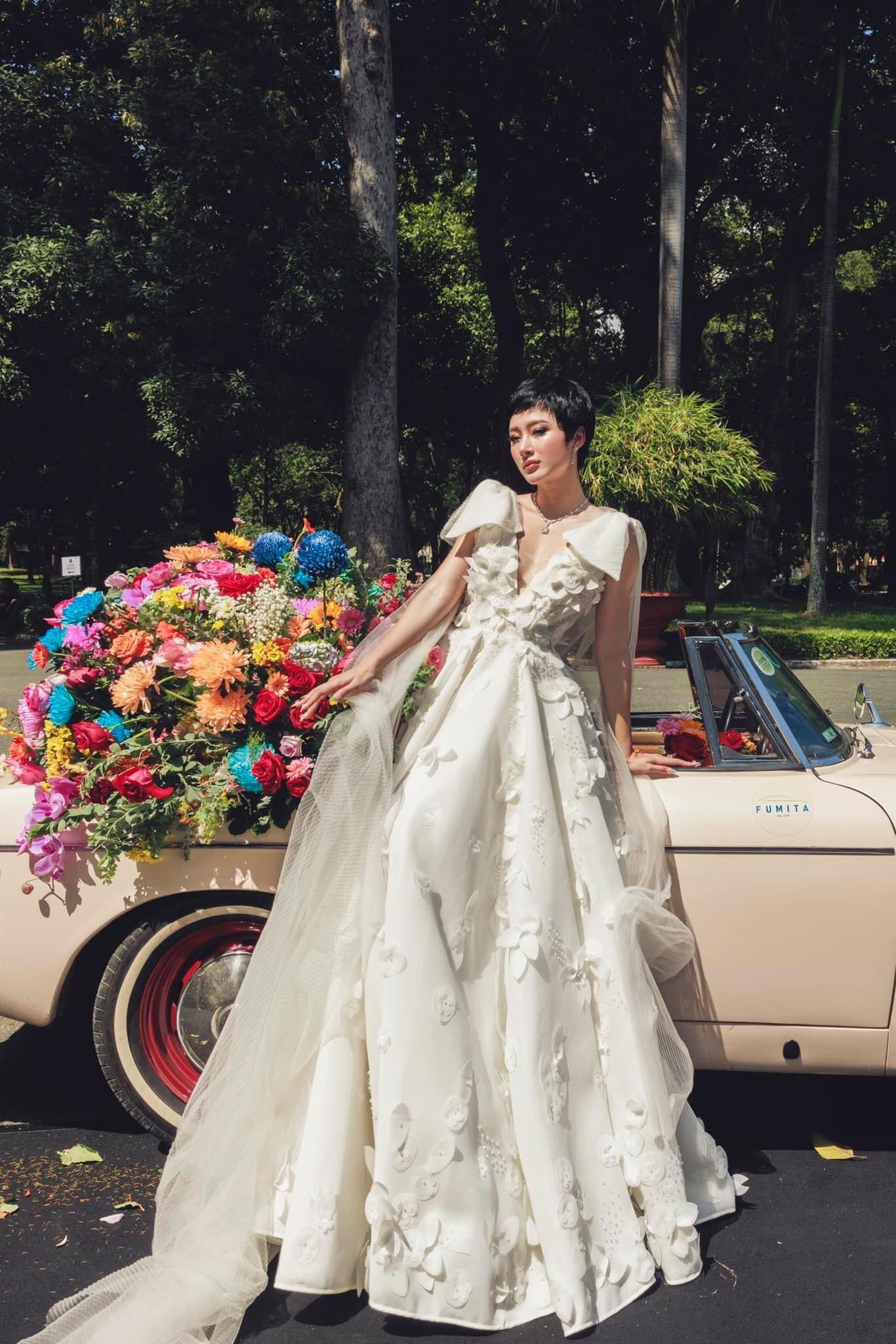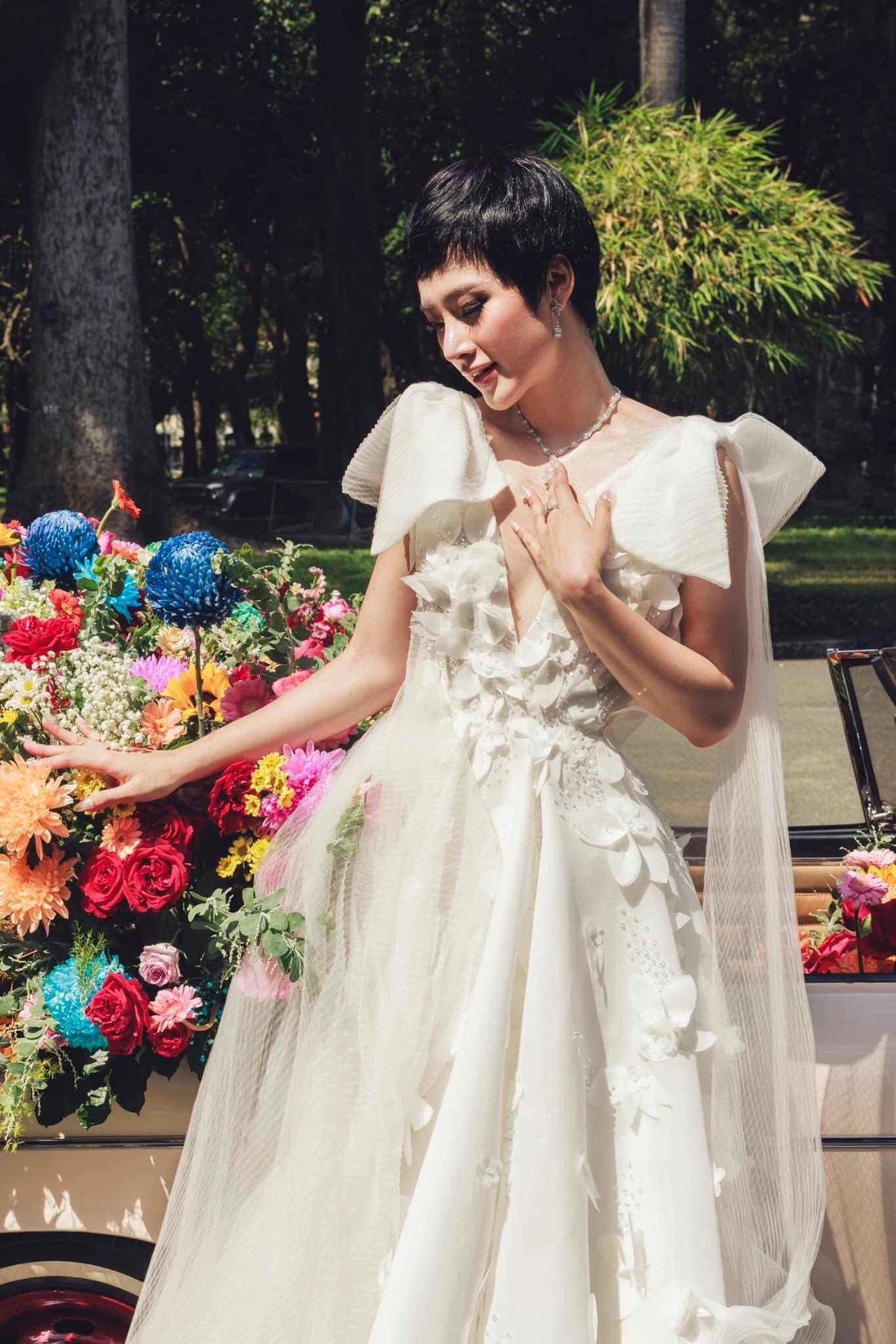 Angela Phương Trinh cá tính trong chiếc đầm công chúa bồng bềnh, điểm nhấn của bộ trang phục chính phần ngực được cắt xẻ tạo bạo. Cô xuất hiện trong diện mạo mới với mái tóc tém.