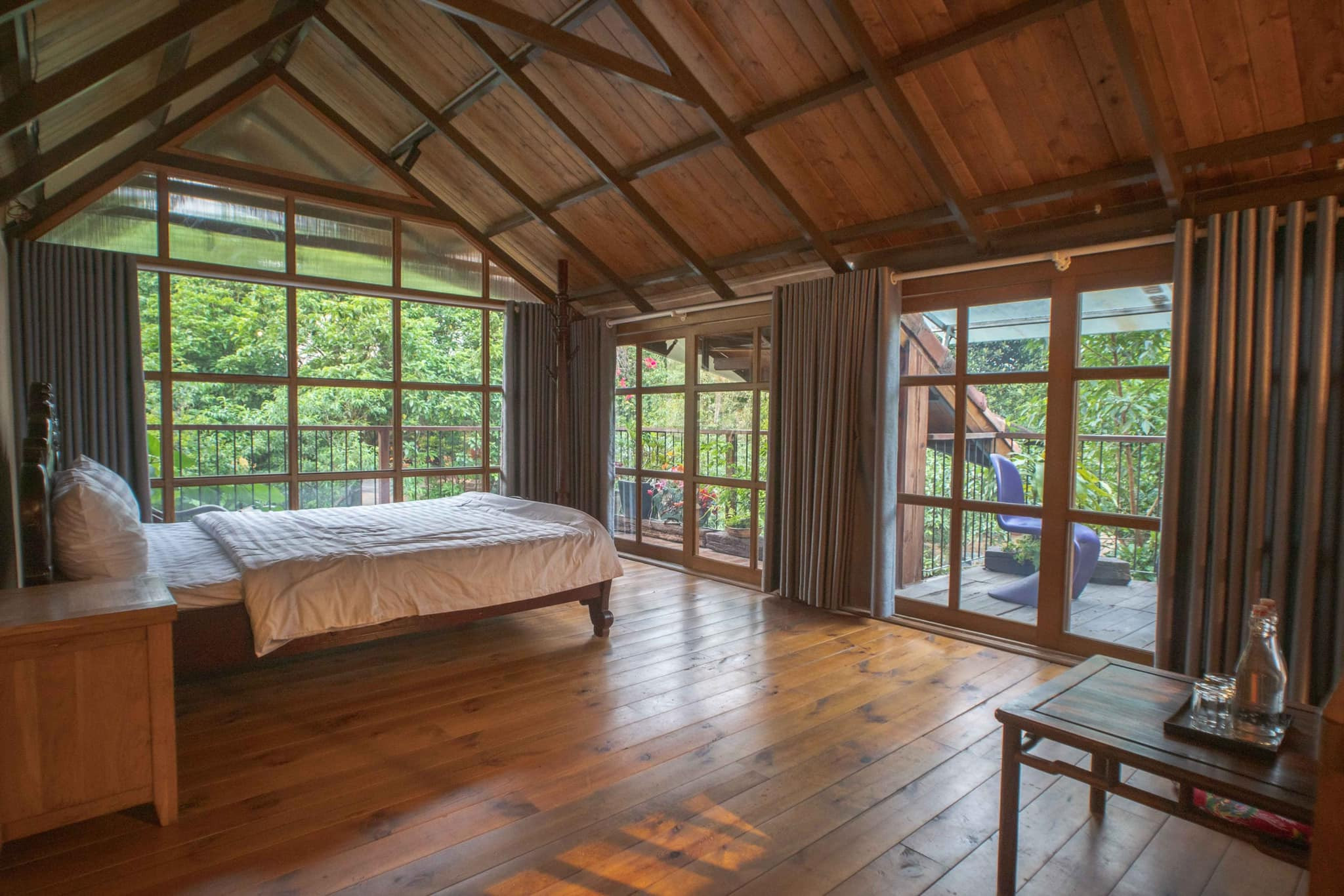 Gia chủ kê đệm trên sàn nhà cho không gian thêm thoáng, đặc biệt hạn chế nội thất để nơi nghỉ ngơi thật yên tĩnh, trong lành và không làm ảnh hưởng đến giấc ngủ. Khu ra ban công được đặt bồn tắm gỗ ngâm thuốc bắc của đồng bào dân tộc và sàn trải sỏi mát-xa chân.