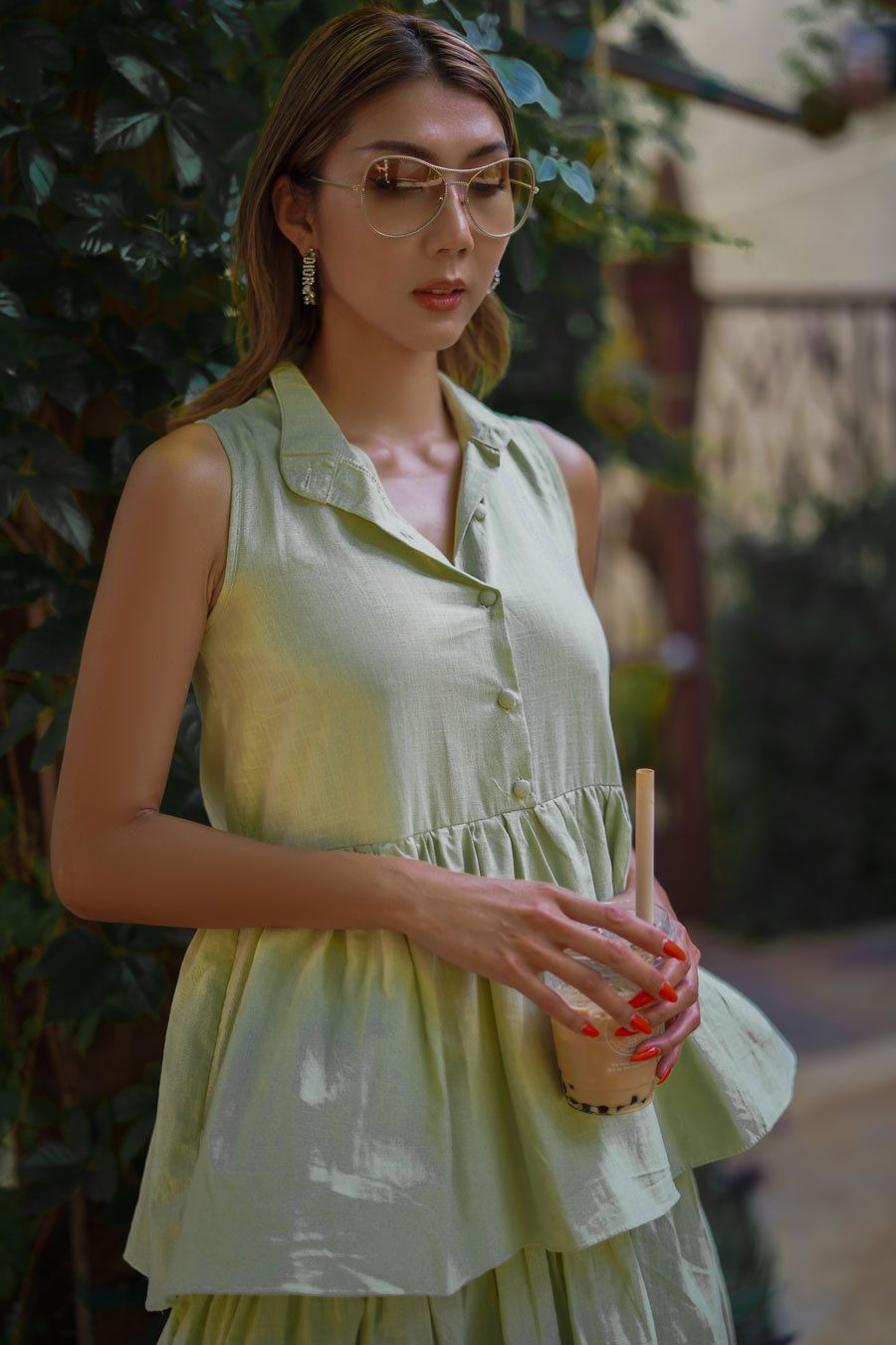 Ngọc Quyên cũng chọn váy xếp tầng, ngọt ngào nhưng vẫn đảm bảo mát dịu ngày hè khi dạo phố. Váy được thiết kế cổ trụ, có thể linh hoạt trong khi mặc. Cô lúc kín đáo, khi lại gợi cảm thả khuy hững hờ. Chất liệu linen, một sự lựa chọn hoàn hảo cho ngày hè khi có thể thấm hút mồ hôi, mát, được Ngọc Quyên yêu thích đặc biệt. Cựu siêu mẫu chọn gam màu trung tính, như nude, xanh pastel khi dạo phố.
