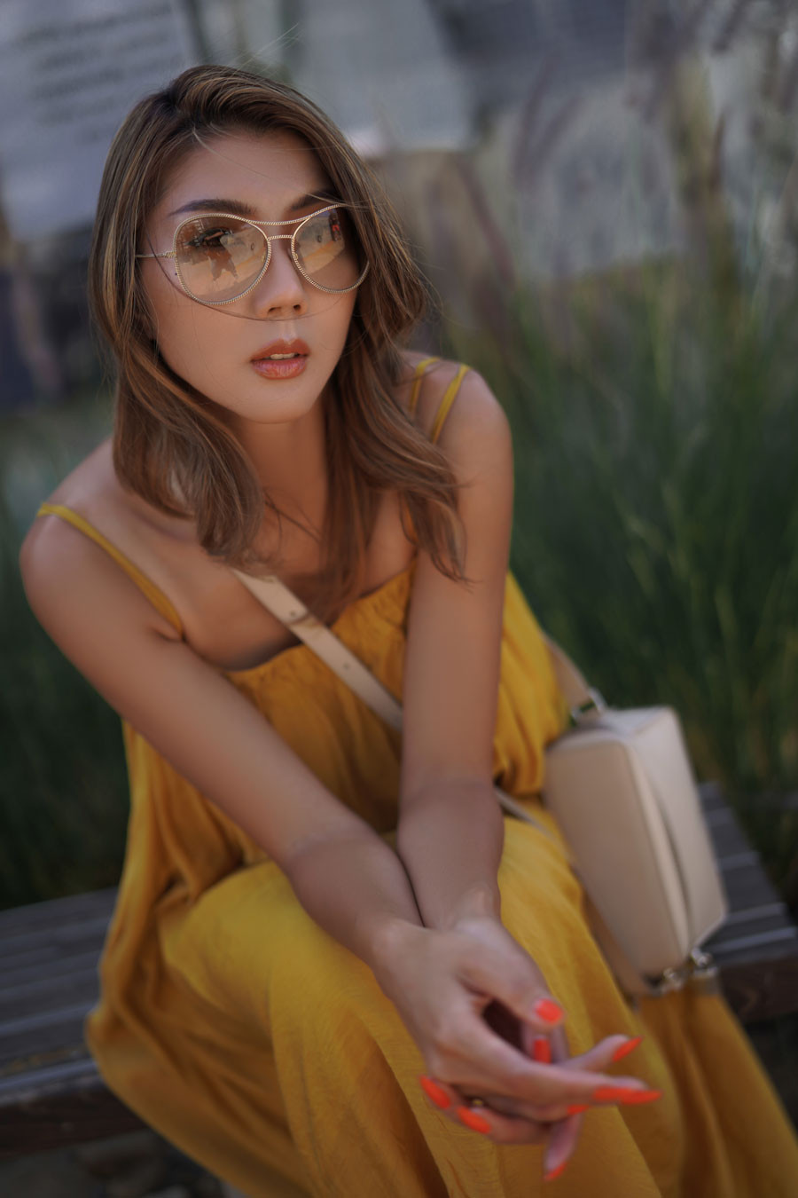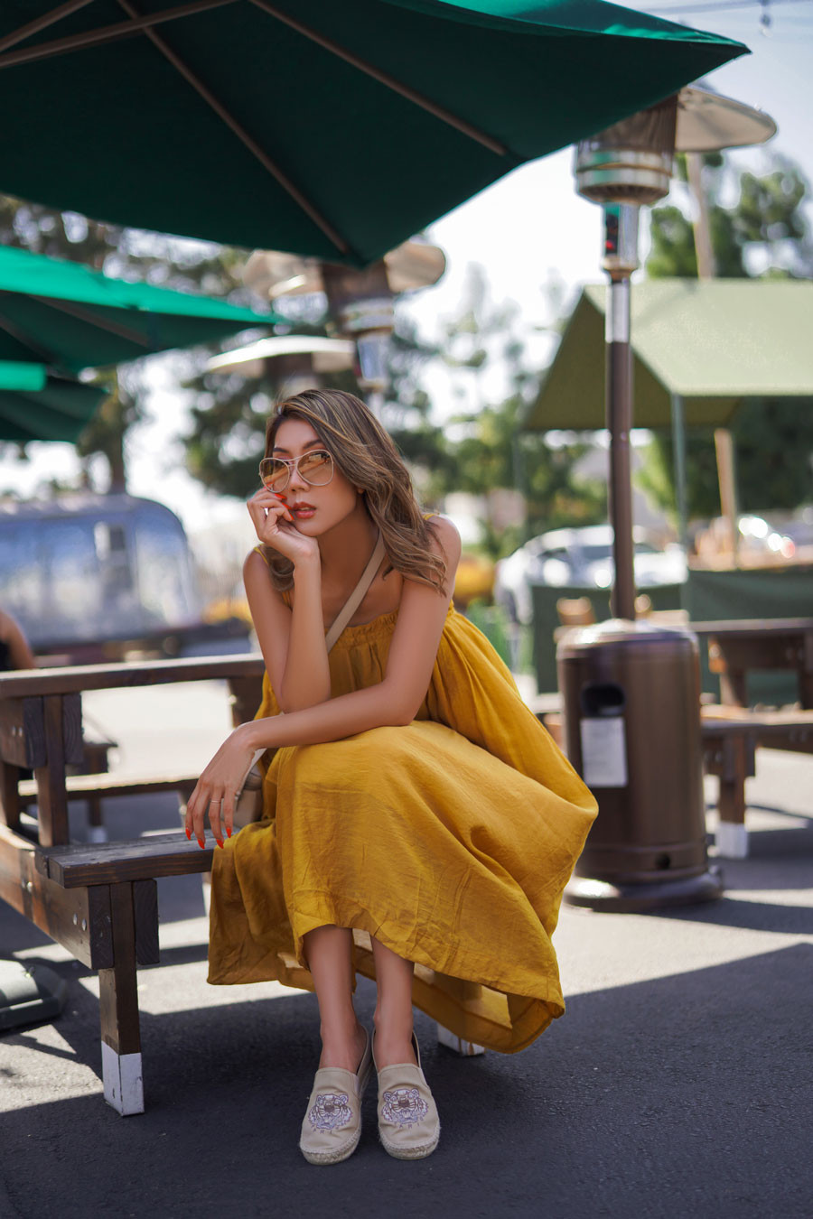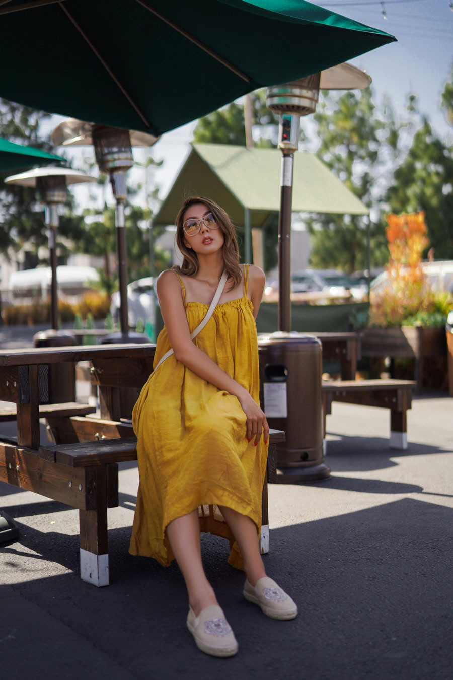 Ngọc Quyên chọn váy 2 dây phom suông, mix với slip - on đầy phóng khoáng. Váy tone vàng mơ đem đến hình ảnh ngập tràn sức sống. Chất liệu tơ, mềm, nhẹ chính là lựa chọn hoàn hảo trong ngày hè nóng.