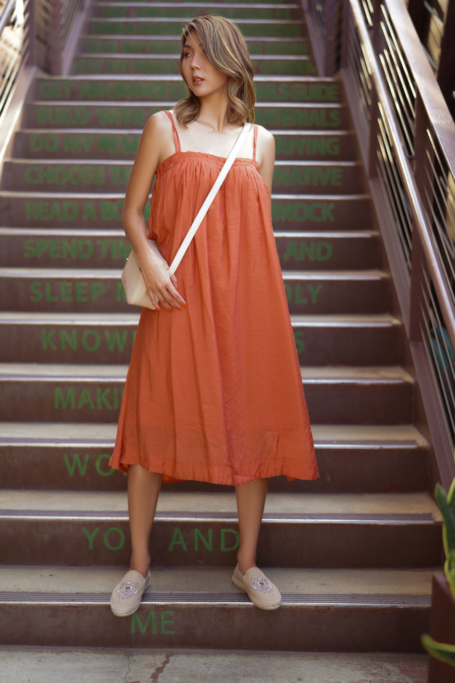 Váy 2 dây màu cam cháy, cũng là lựa chọn phù hợp với làn da nâu khỏe của Ngọc Quyên. "Tôi thích mặc những chiếc váy 2 dây dáng suông vào mùa hè, đây là kiểu đồ không thể thiếu của tôi trong ngày nắng nóng. Kiểu đồ cơ bản này, luôn có tính ứng dụng cao", cô nói.