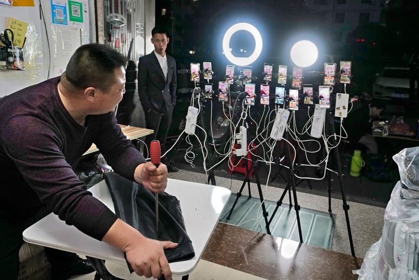 Những chiếc điện thoại cùng đèn LED hỗ trợ ánh sáng phục vụ cho livestream trong làng (Ảnh: Sixthtone).