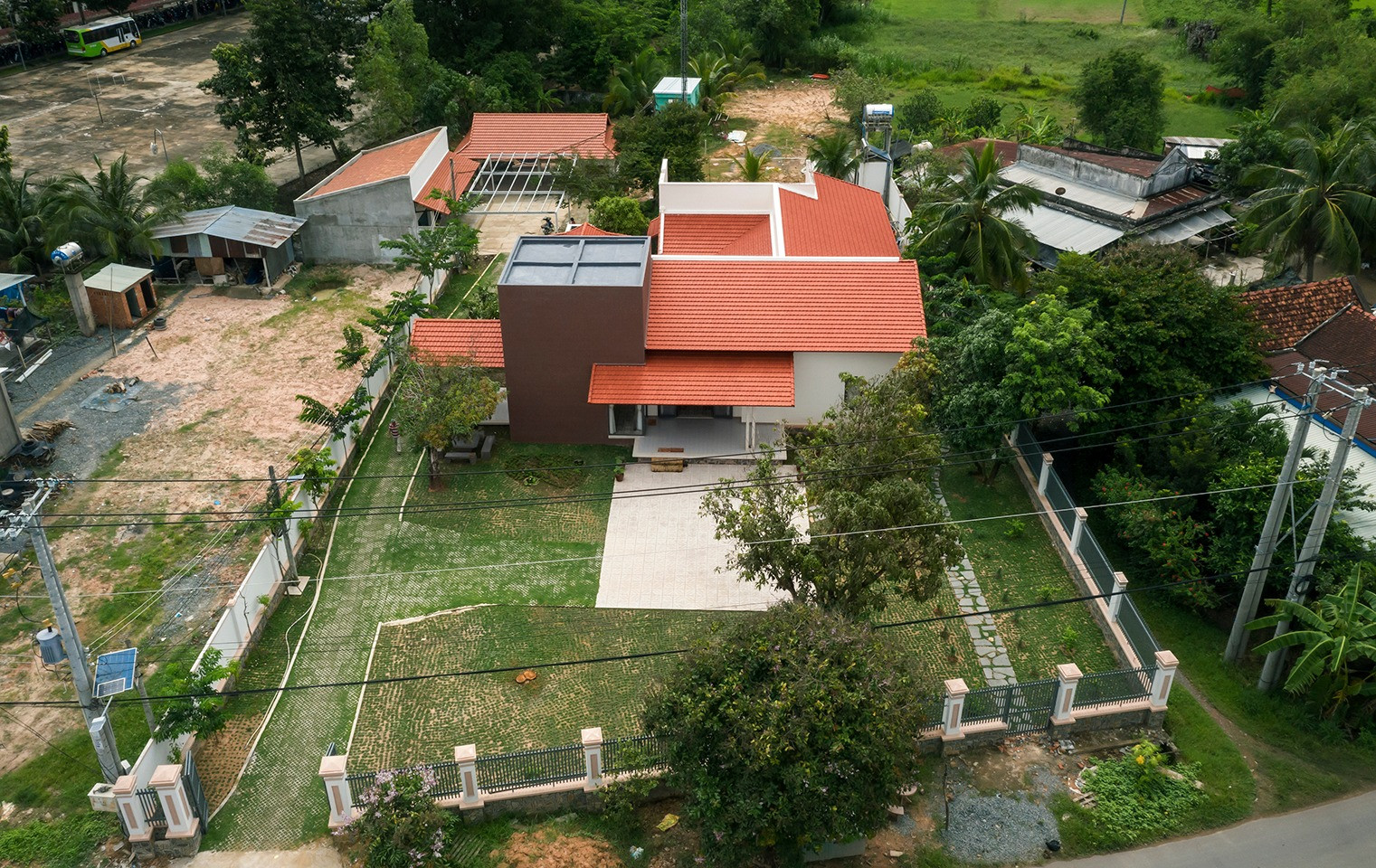 Tổng thể ngôi nhà là hệ mái ngói đỏ truyền thống đại diện cho thế hệ ông bà quây quanh một khối vuông bê tông vươn lên đại diện cho sự phát triển mạnh mẽ cho thế hệ trẻ tiếp nối. Khối vuông bê tông cũng nhằm mục đích để tránh bão lụt sau này. Thợ xây dựng và vật liệu xây dựng đều ở địa phương.