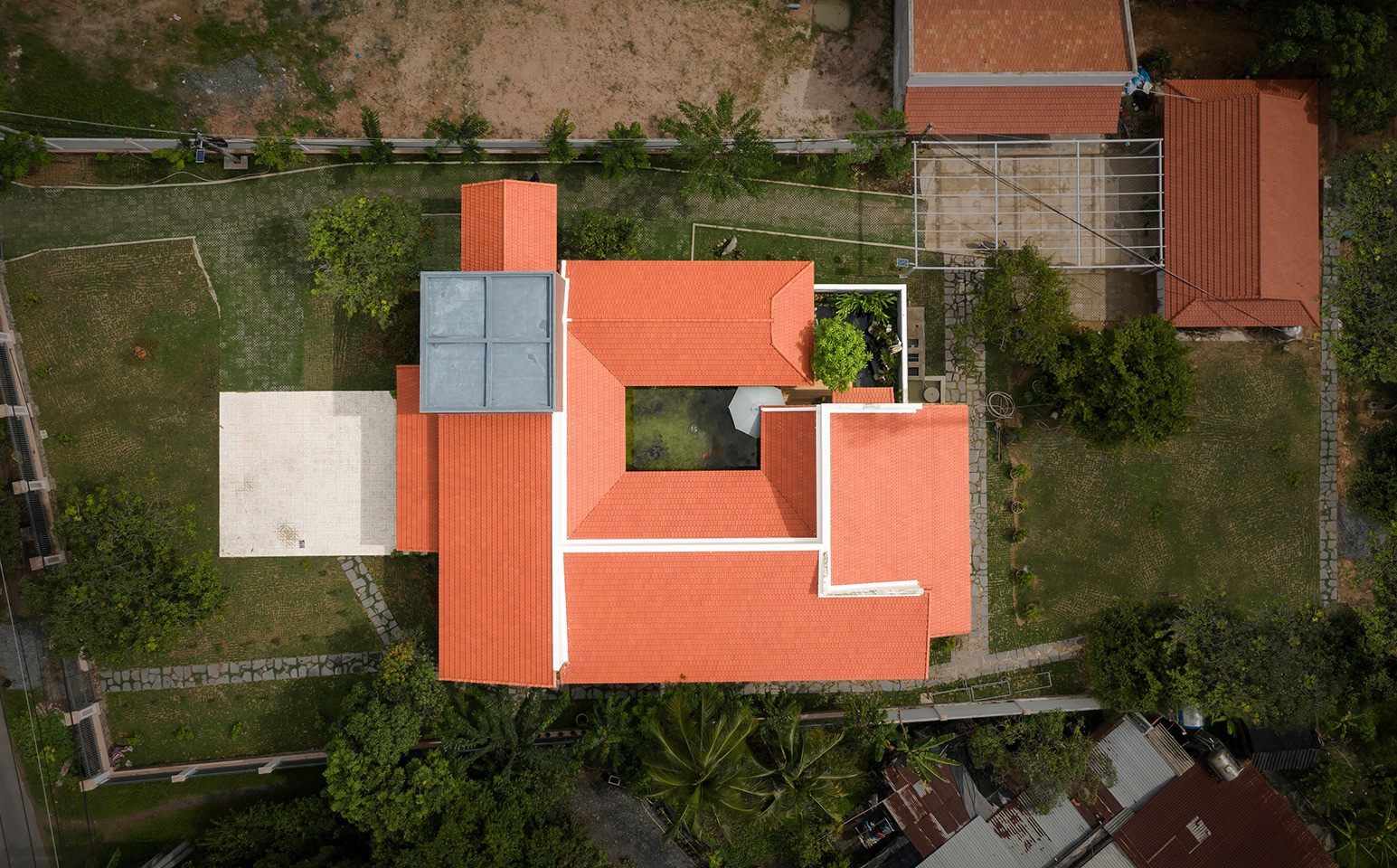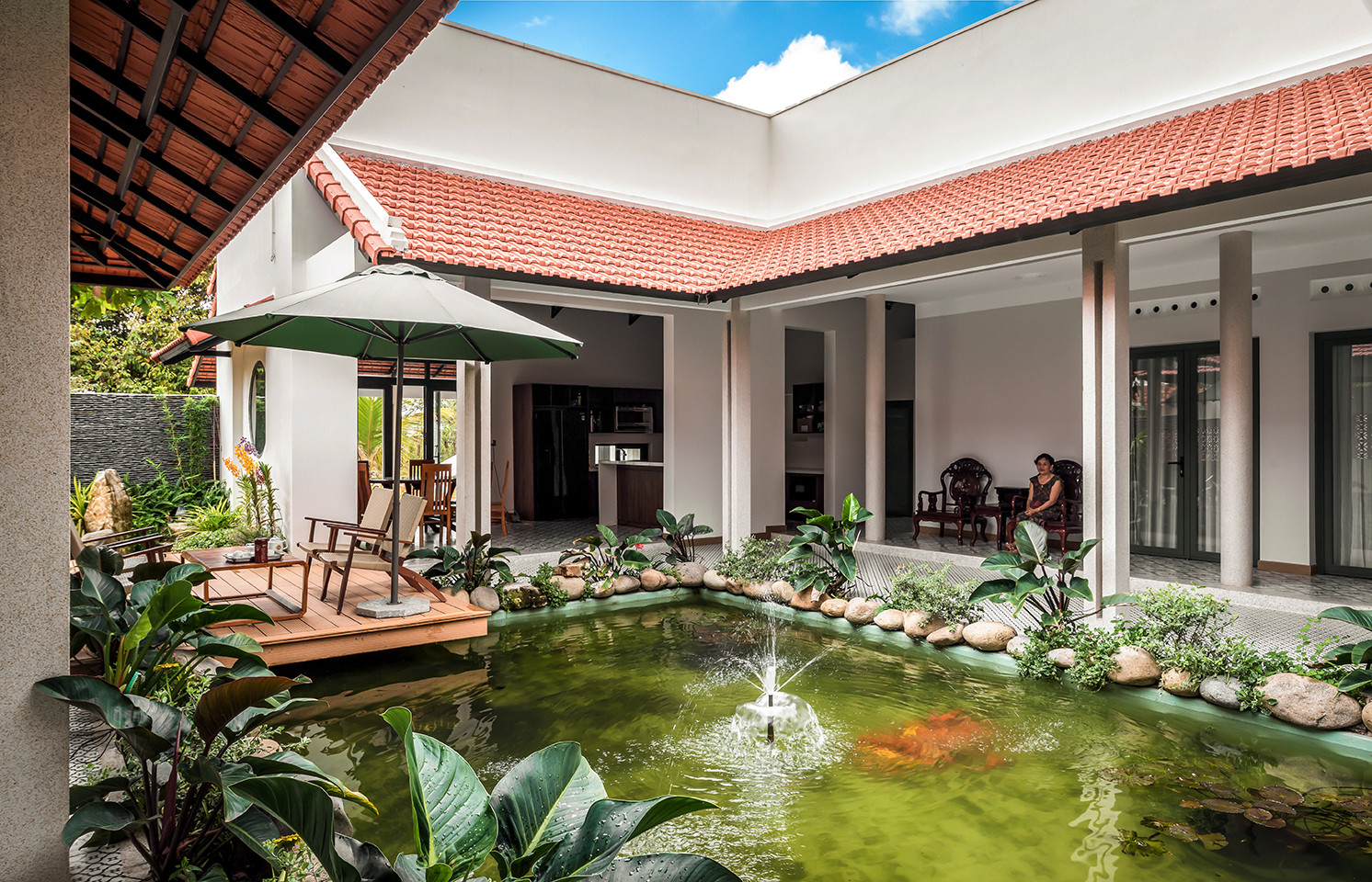 Hồ nước chính là tim của ngôi nhà, có tác dụng điều hòa không khí vào ngày nắng nóng và cũng thoát nước khi mưa gió. Khi ngồi dưới mái hiên, có thể ngắm một khoảng trời xanh trong vắt, dịu nhẹ.