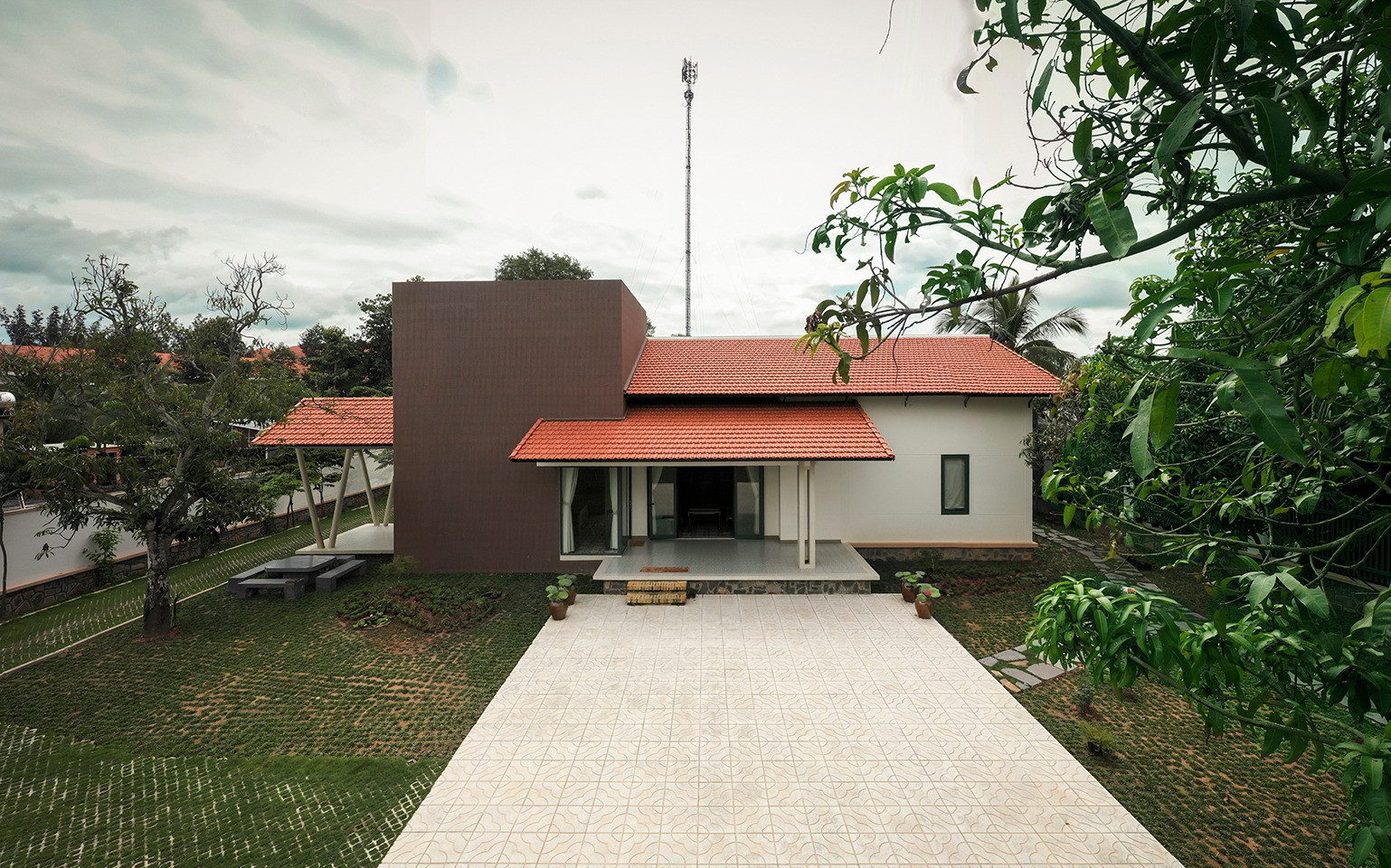 Công trình nổi bật với mái ngói đỏ và thiết kế mái dốc, phát triển từ bố cục nhà 3 gian xưa.