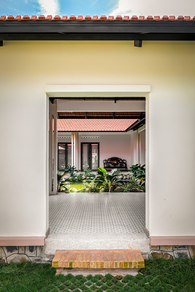 Khu vực sân bao quanh trồng cỏ, hút nước mưa và giảm bức xạ nhiệt. Kiến trúc sư chỉ ốp đá một khoảng nhỏ trước mặt tiền làm lối đi lại.