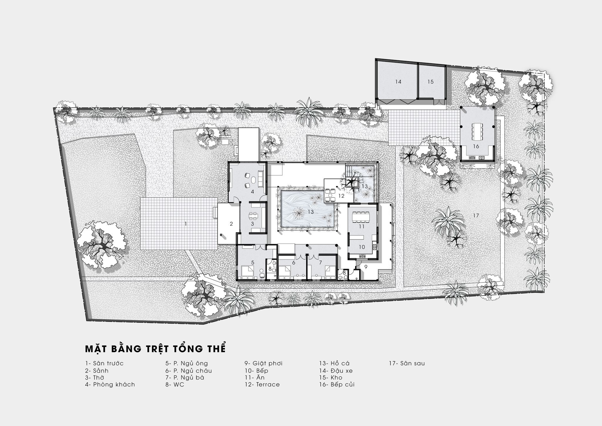 Không gian bếp đặt sau cùng khóa lại tạo ra không gian sân trong để đại gia đình sinh hoạt quây quần bên nhau. Sân trong là một hồ cá và cây xanh tạo không khí mát lành, yên tĩnh cho toàn bộ ngôi nhà.