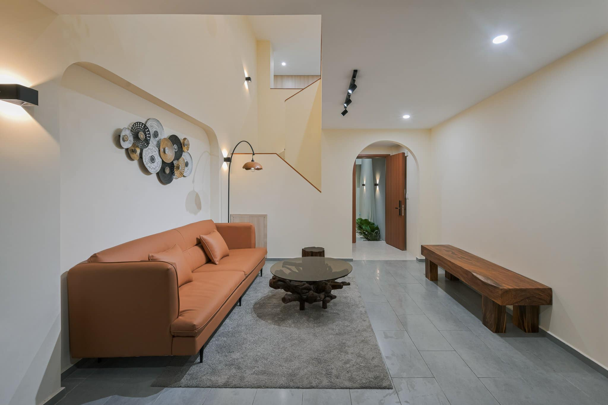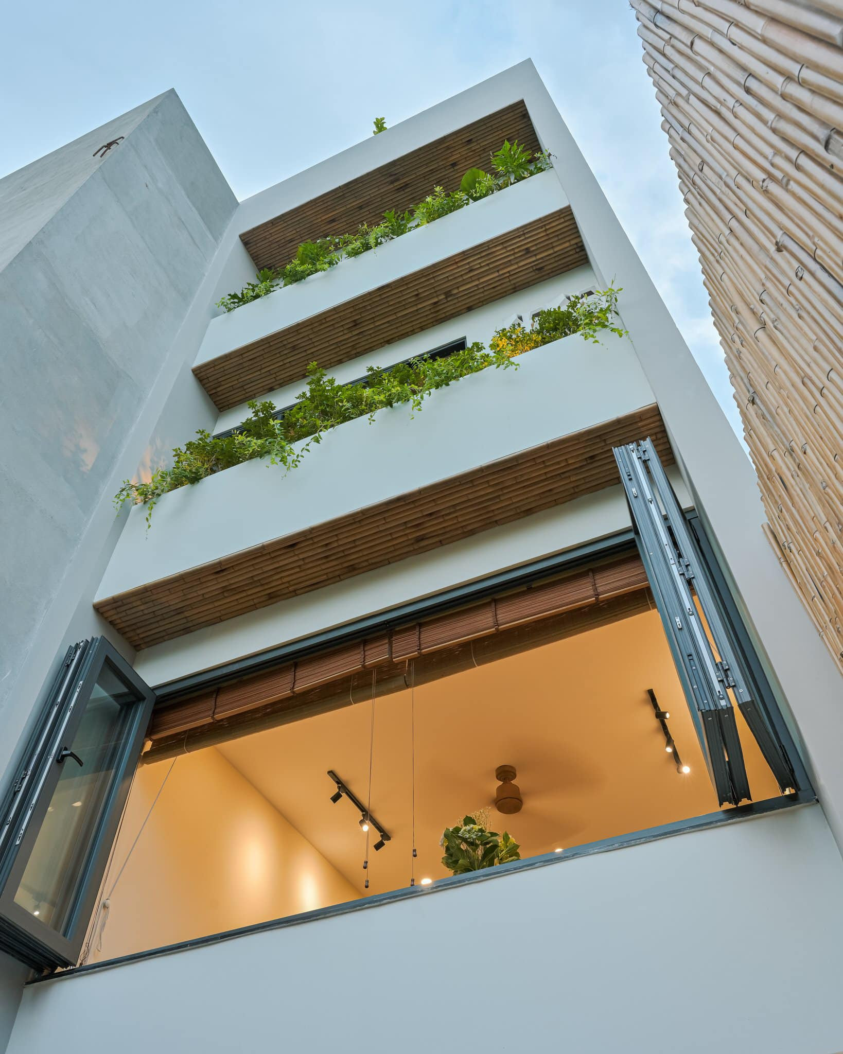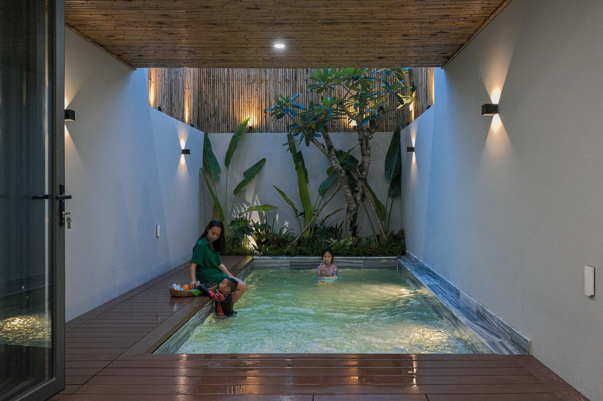 Ngôi nhà của vợ chồng chị Lê Ngọc Trân được hoàn thiện năm 2022. Tuy chỉ có diện tích 4x20m nhưng vẫn tích hợp đầy đủ công năng của chốn nghỉ dưỡng lý tưởng với bể bơi thư giãn, xung quanh nhà là nhiều cây xanh và những mảng tường ốp tre mát mẻ.